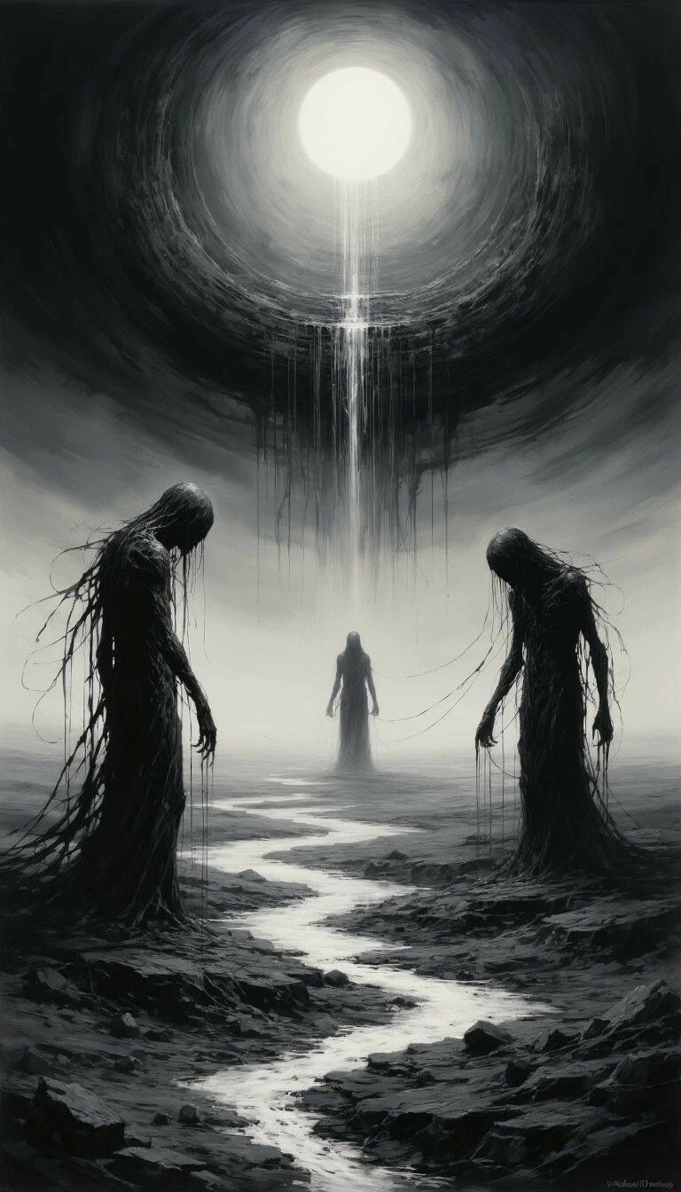 dark vampire ambient slowcore, dark atmospheric ambient music with elements of stochastic sequences, Focused on creating deep soundscapes and textures rather than melody, Organic sound that combines natural synthesizer pads with light technological elements, Very slow, slowcore, almost imperceptible development, Instrumental, for passive listening, meditation and immersion, Sad meditation