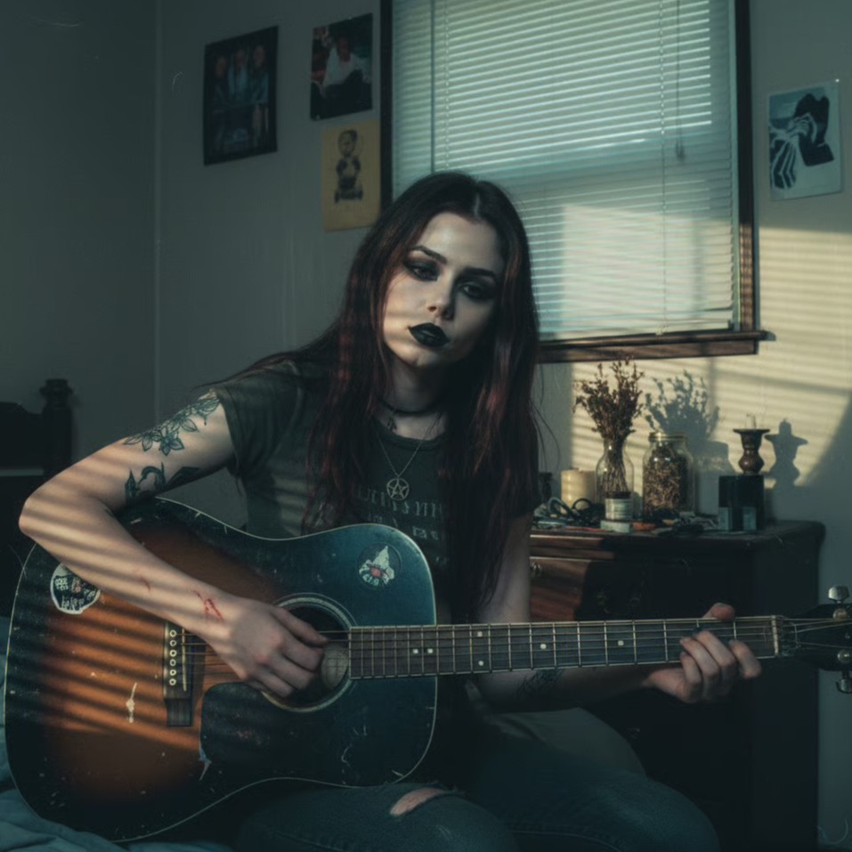 the raw acoustic-grunge core + hard rck track, built on drv-acoustic grit, warm DI lows, and a SM57-mic female raspy lead singer that shifts sneering→furious→chaotic-lift, The mix stays tight and dry-core, with only a lite room-ghost to keep the unplugged ’93 realism, Grain-pushed mids and airy-96k fidelity shape a fragile-to-flare dynamic, where brushed-kit pulses and soft tape-kiss harmonics warm the edges, Each section rises in controlled arcs, keeping intimacy intact while letting emotional tension flare naturally, ‑trumpet, ‑brass, ‑cello