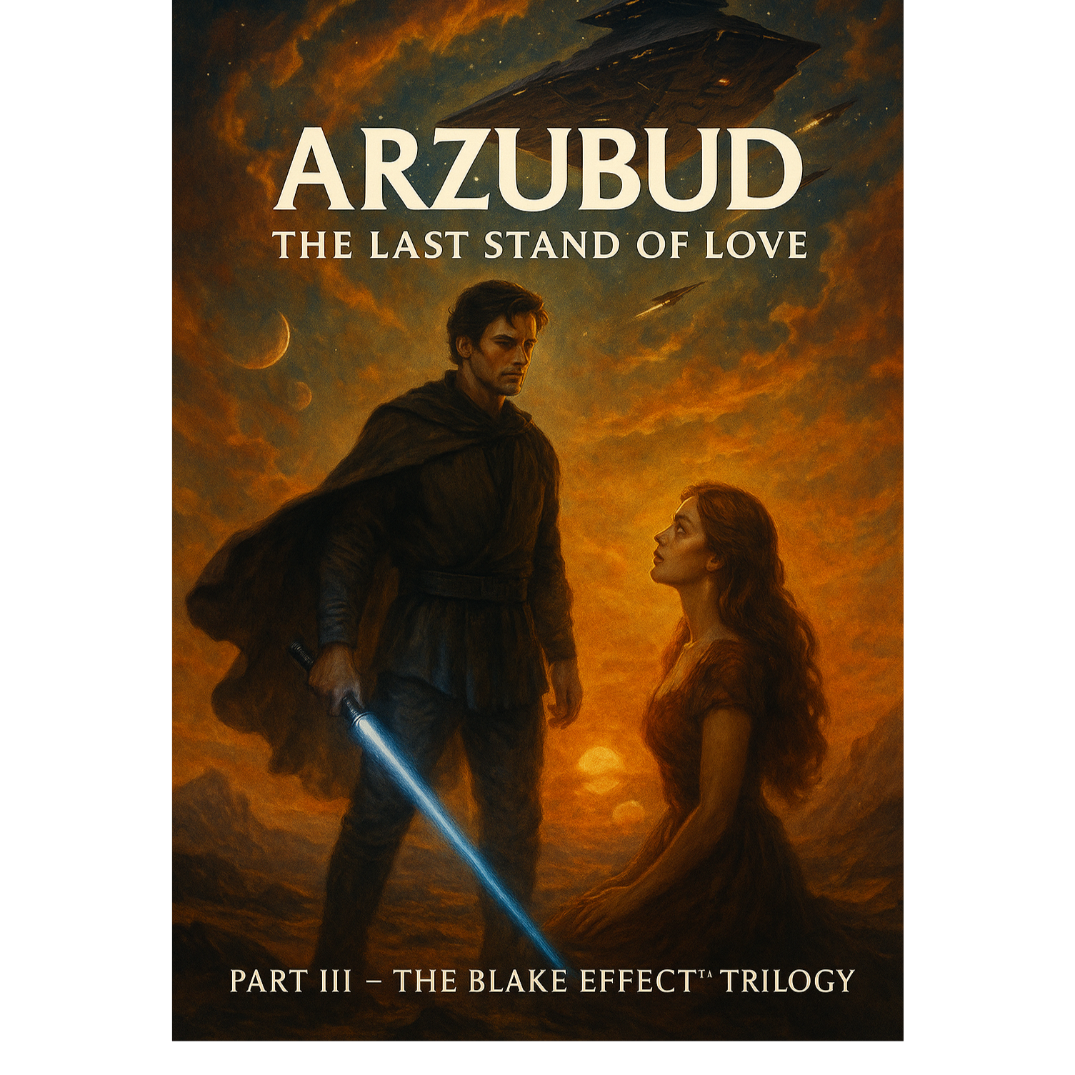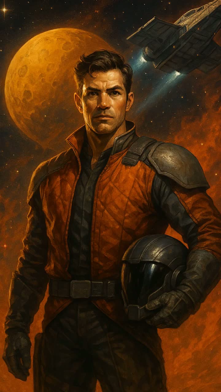 Full epic Star Wars–style orchestral score with massive John Williams energy, Sweeping heroic brass, soaring violins, powerful trumpet fanfares, deep cinematic percussion, and explosive timpani, Add emotional choir harmonies, mystical woodwinds, and swirling space-opera strings, Blend with subtle sci-fi shimmer: soft synth pads, cosmic ambience, distant battle rumbles, Tone: grand, romantic, destiny-filled — like a final stand on an alien world, Music should feel like a climactic movie moment where a hero risks everything for love, Triumphant, dramatic, emotional, mythic, Vocals: bold, heartfelt, heroic — filled with sacrifice, devotion, and cosmic passion