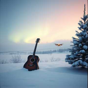 instrumental, folk guitar, banjo, gentle piano, Drone keyboars with subtle LFO on the keyboard and delay, slowly building with lo-fi beats into an anthemic drum and bass ending, Minimun length 5 minutes