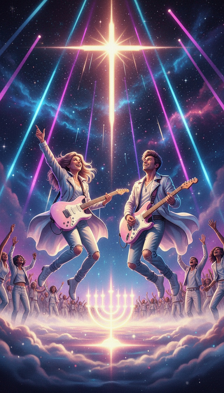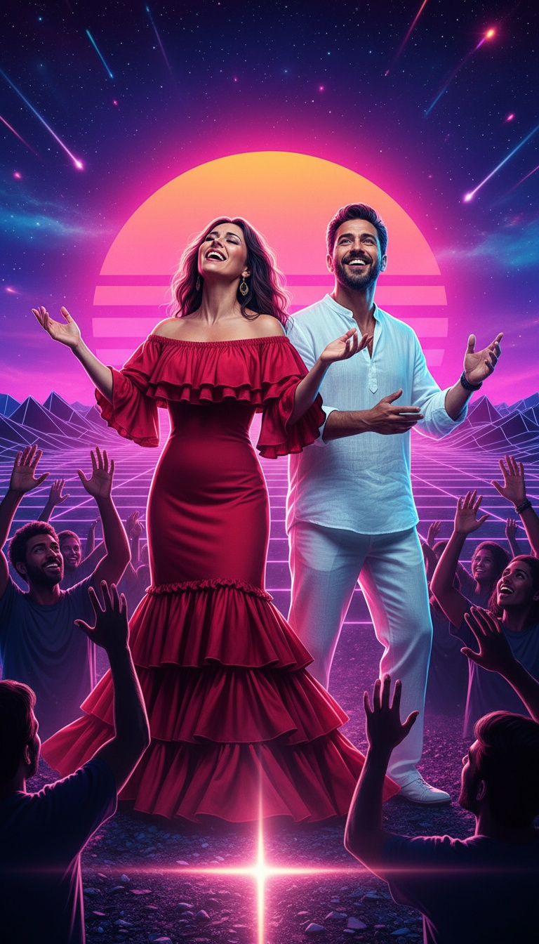 Flamenco y guitarra flamenca chill rápida+ pop rock, Powerful emotional intro and majestic final, respiraciones y pausas, Male lead vocal, clear, energetic, emotional, age ~40, confident and intense, Female backing vocals and choirs, melodic and atmospheric, age ~35, adding harmony and lift in choruses, Fast synthwave, Tempo rápido (160–180 BPM), Melodic chill flamenco guitars, sharp synth arpeggios, futuristic celestial pads, Epic, direct, energetic, vivid, modern yet emotional, Mood: urgent, decisive, hopeful but severe, Theme: life vs death, judgment, choice, faith, redemption, finality of evil, no eternal torment, Clean production, powerful dynamics, memorable chorus, electronic, female vocals, acoustic guitar, orchestral, violin, bass, epic, pop rock, soul, smooth, alternative rock, indie, fast, electropop, indie pop
