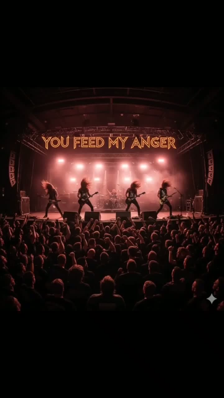 Early 80s thrash metal energy — raw and aggressive underground metal band on a dark club stage, fast palm-muted guitar riffs, relentless drumming, snarled shouted vocals, Denim and leather, sweat and smoke filling the air, chaotic headbanging crowd, Gritty analog sound, minimal polish, high speed and pure rage, Lyrics driven by anger, defiance, control, and inner fire, Street-level intensity, youthful rebellion, no compromise, no mercy, Kill-’Em-All-era thrash metal atmosphere, Live concert feeling