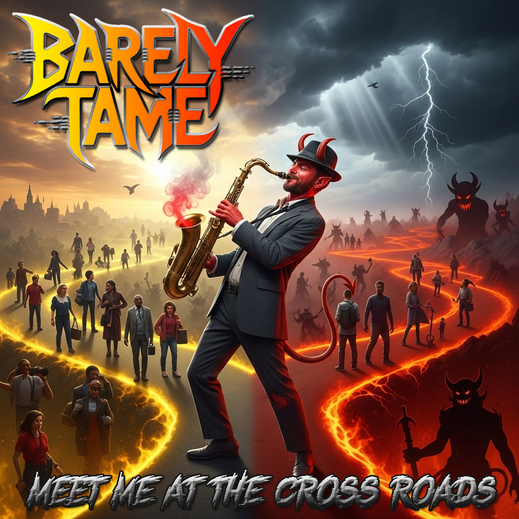 electric guitar, power metal, fast, high notes, saxophone, catchy, harsh vocals, raspy baritone with operatic high notes, backing vocals