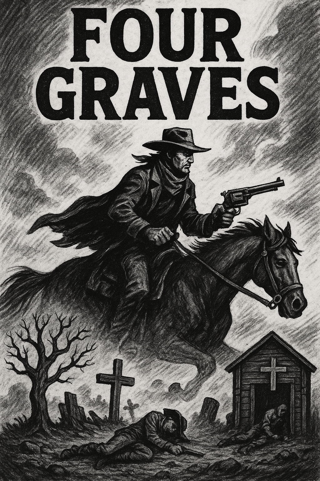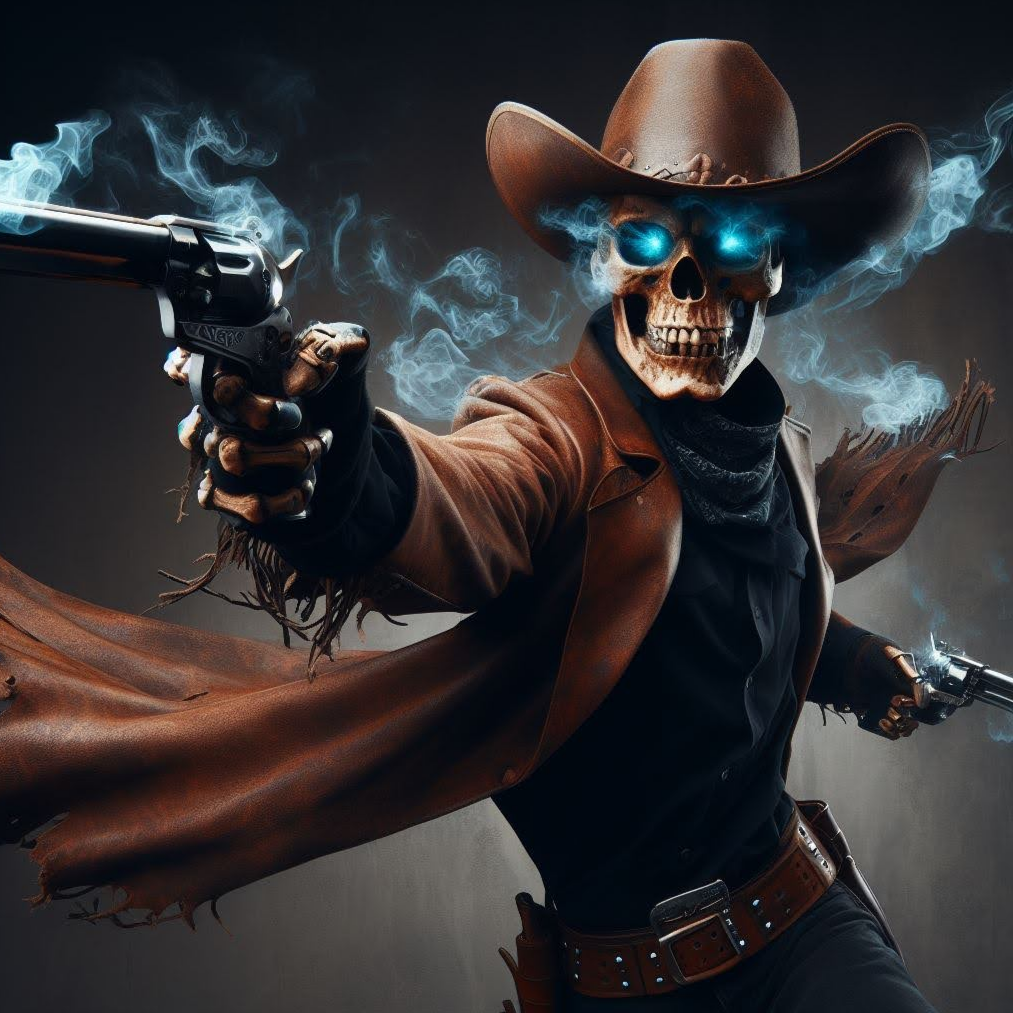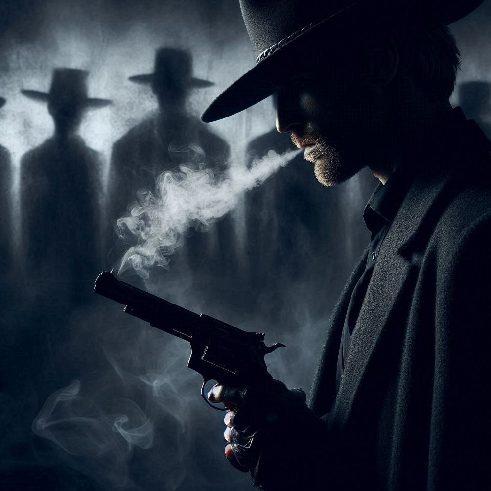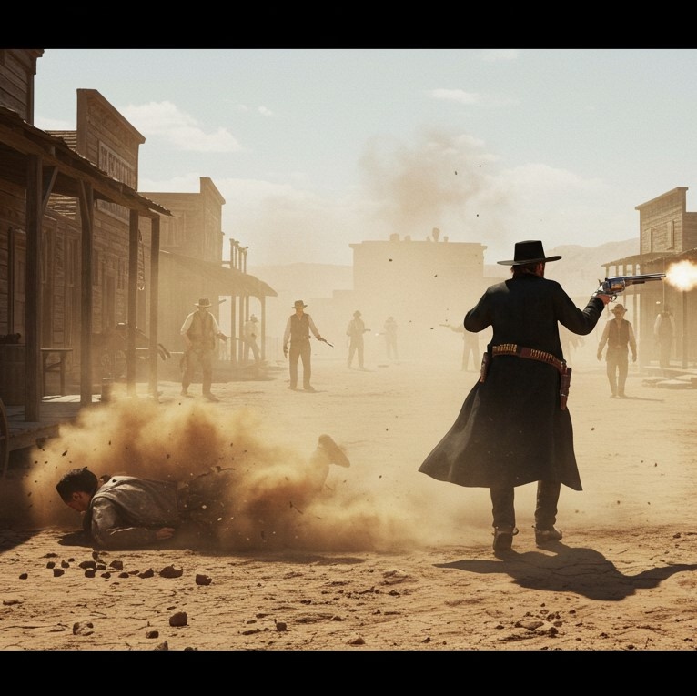 Italo-Western cinematic showdown, Mid-tempo, ~95 BPM, spanish guitars, dry acoustic strums, steady snare, Spanish castanets, occasional trumpet stabs, whistle hook, keep it dark and cool, Lead vocal: very deep male cowboy voice, raw, gravelly, charismatic, like an old gunslinger storyteller, Solo voice only, no choir, Verses dry and tense with low vocal delivery, pre-chorus building intensity, Chorus: wide, cinematic, with brass accents and guitar riffs, but still carried by the deep cowboy vocal, Include whistle intro hook, whip FX for showdown break, instrumental interludes with guitar and mouth harp, Bridge: stop-time drums + whip FX, tense silence, then explosive return, Final chorus: epic but gritty, with brass stabs, guitars, and the low cowboy vocal driving it, Outro: whistle hook fades into dusty silence, Style: dark and cinematic – no swing, no honky-tonk