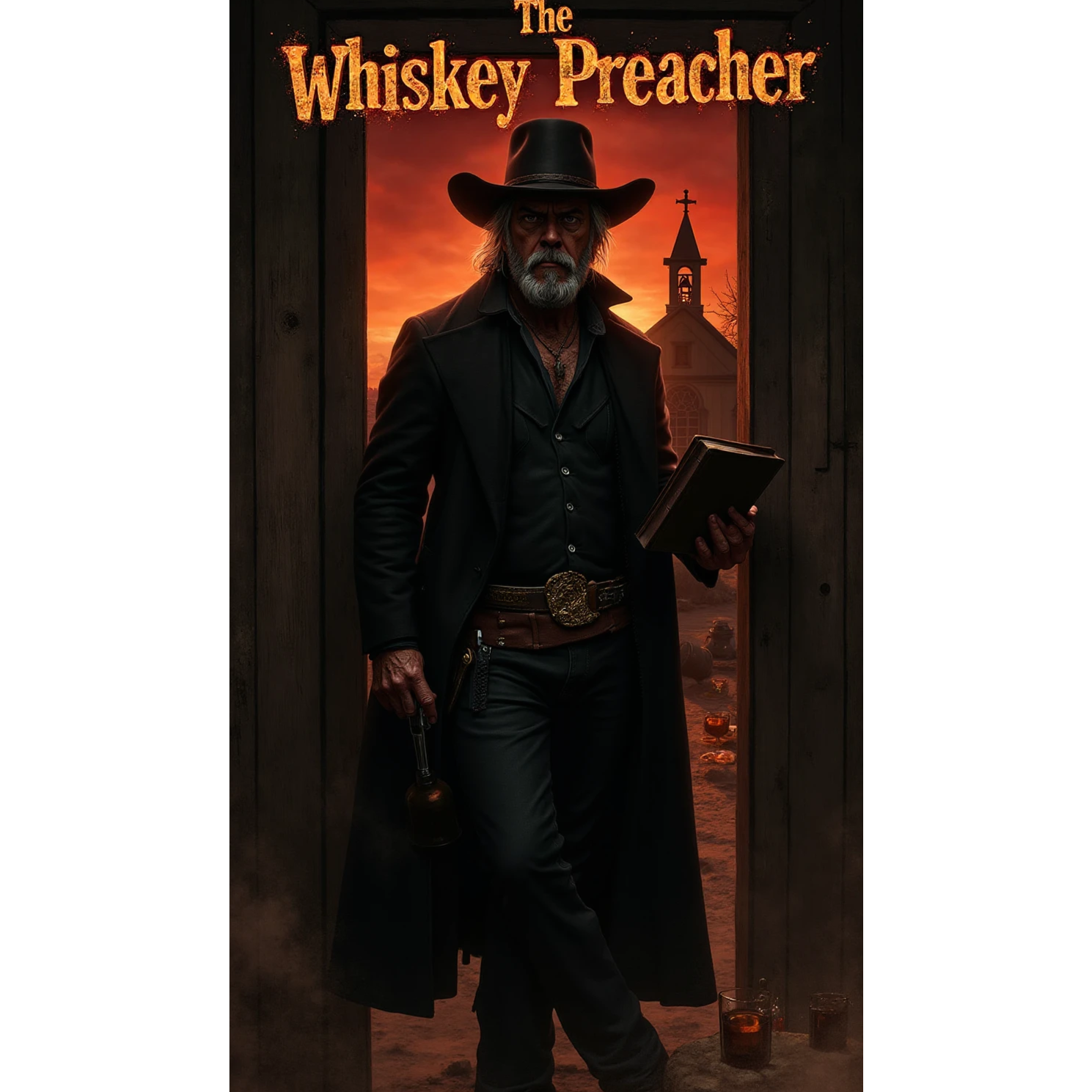 Dark western gospel, Industrial Metal, Steampunk, Deep, gritty male vocals, Acoustic and electric guitars with reverb, ghostly backing chants, cowboy baritone harmonies, galloping rhythm, cinematic drums, mournful violin, distant church bells, and wind whistling through the frozen plains, A mix of outlaw country, dark Americana, and epic frontier sound, Themes of divine judgment, faith, bullets, redemption, and the frozen wasteland, Heavy, atmospheric, spiritual, and mythic