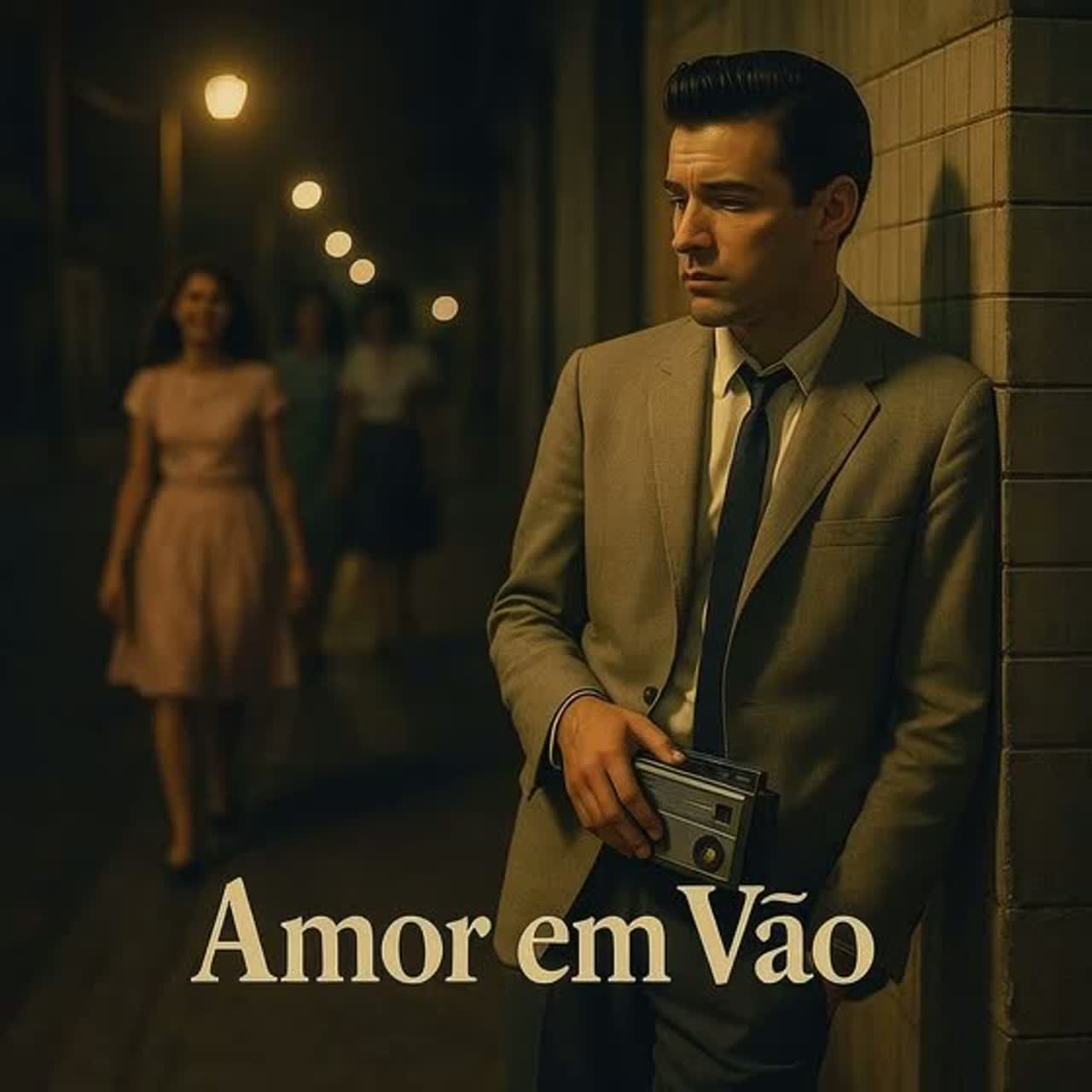 1960s, Genre: Jovem Guarda with rockabilly influence (1960s), Instrumentation: Twangy electric guitar with slapback echo, rhythmic acoustic guitar, upright piano, walking electric bass, energetic vintage drums with rimshots and snare rolls, tambourine, Male lead vocal: dramatic, slightly melancholic, with playful adlibs (“ai, ai, ai, ”, “Oh não, ”), clear diction, and expressive vibrato, Structure: Intro with guitar riff, verse, catchy chorus with call-and-response, verse, chorus, instrumental break with guitar and piano, final chorus, outro with band hits and vocal adlibs, Backing vocals: echoing phrases in the chorus, Mood: Melancholic yet danceable, with a sense of youthful longing, Production: Mono or narrow stereo, tape saturation, prominent slapback on vocals and guitar