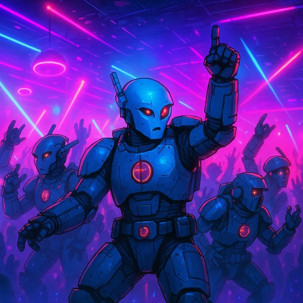 - Beat: Steady 4/4 kick, sidechained to deep, pulsing bassline, - Synths: Glassy pads, bright arps, funky clav-like stabs, - Bass: Slap-bass synth with octave jumps, tech clean, - Vocals: Robotic vocoder, layered harmonies, alternating between hypnotic repetition and short sung phrases, - Guitar: muted funk guitar for the groove sections
