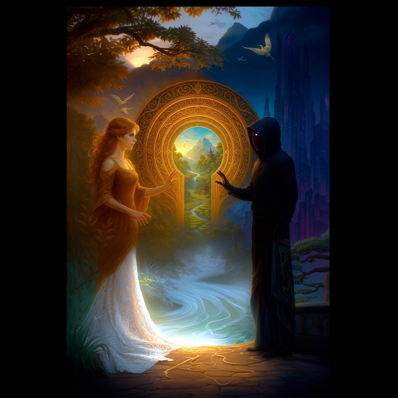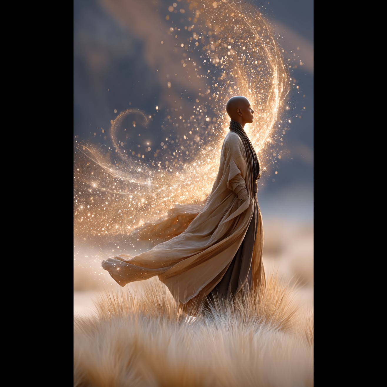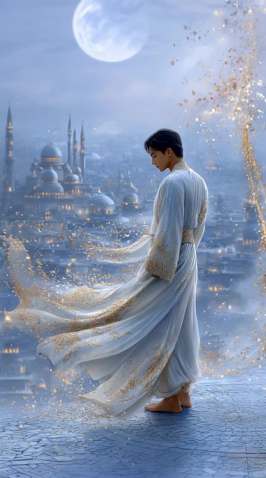 Cinematic ethno-fantasy journey blending romantic orchestral ambient, Middle Eastern downtempo, and dreamlike world textures, Tempo: ~82 BPM, Smooth evolving transitions reflect the magical flight of Prince of Persia, Female vocals, Rich sound design with soft strings, ethnic percussion, harp glissandos, bamboo flutes, duduk, kanun, sitar, and erhu; interwoven with ambient pads, starlight chimes, desert wind FX, and gentle vocal hums, Emotional arc begins with wonder, flows through awe, joy, and romance, and ends in serene intimacy at dawn