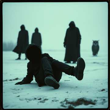Dreamlike surreal illustration of a nightmare vision, A person lies fallen on the ground, unable to stand, ashamed, trying to put on shoes in winter frost, Dark figures walk nearby, blurred and faceless, dangerous, In the room — a dark owl growls, chains and fishing hooks hang from invisible threads, one hook attached to the throat as if pulling down, In the corner — a raccoon hides in shadows, Atmosphere: gothic, haunting, but not horror — more like a symbolic dream, Colors: black, deep silver, faint golden light breaking through, Add mist, glowing haze, and blurred edges as in sacred visionary art, Style: black and white with slight golden accents, meditative but heavy, ambient cover art