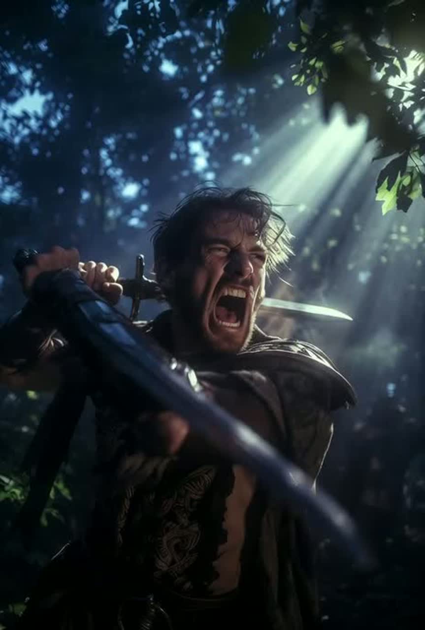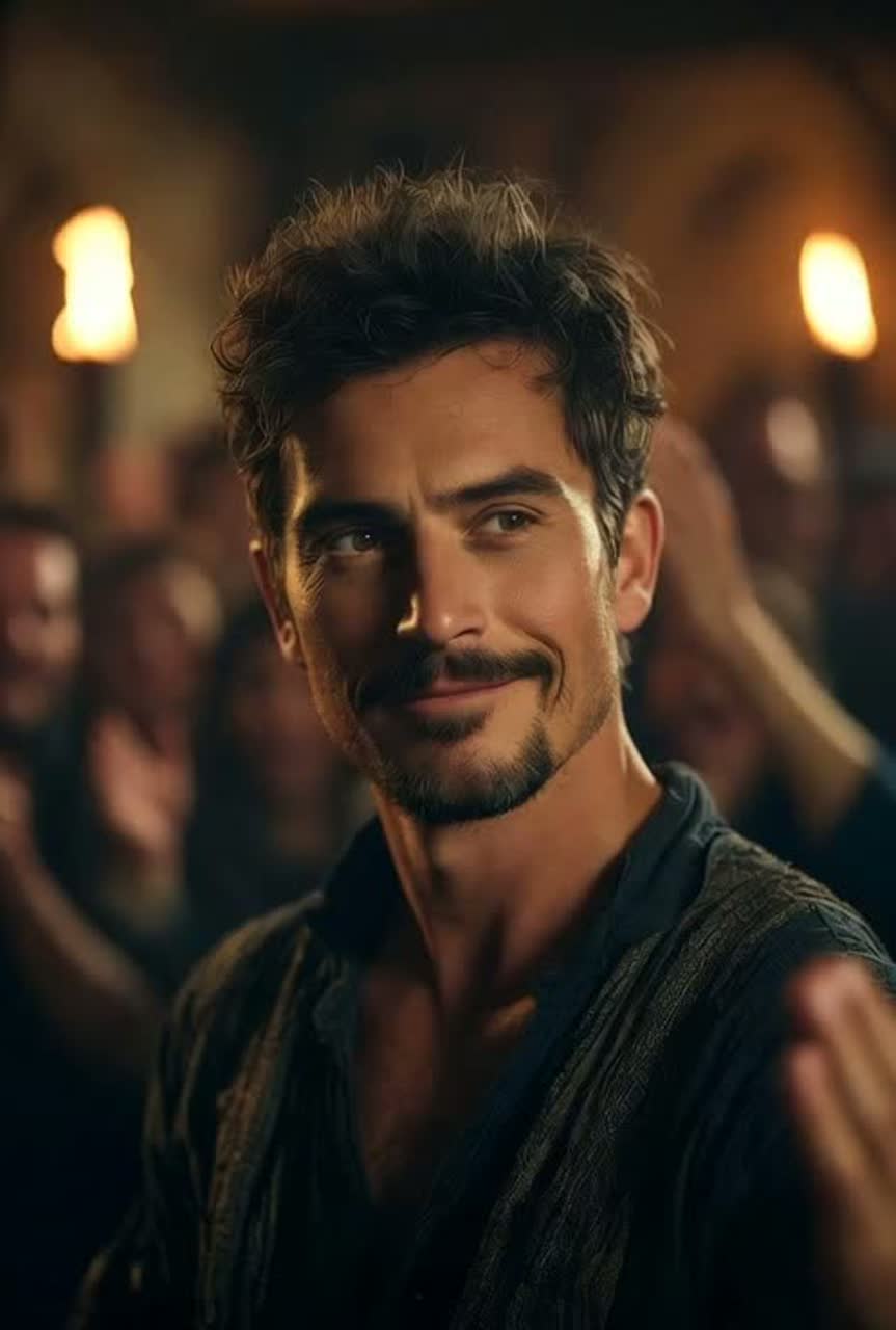 Epic high-flying cinematic folk-orchestral adventure anthem, bold male bardic tenor dripping with roguish charm, cheeky gusto, and irreverent delight, lively fingerpicked lute and buoyant hand-drums driving the rhythm, bright soaring violins, triumphant horns, and sparkling percussion for festival-like energy, atmosphere of twilight riverbank turned victory parade, natural reverb like open skies and ancient stone, focus on infectious joy, swaggering confidence, and the thrill of embracing the impossible with a wink