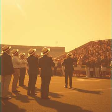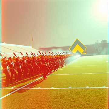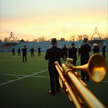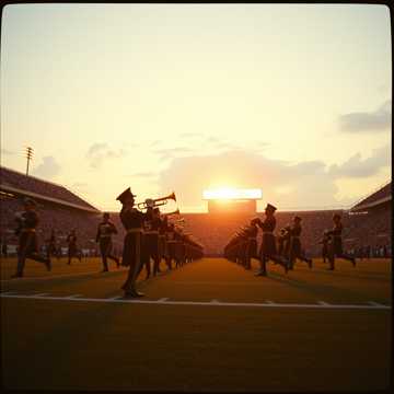 1970s stadium rock, marching band brass, rolling stones swagger, raw and loose, trumpet section, trombone slides, snare drum cadence, college football energy, crowd noise, irreverent and cocky, slightly sloppy perfection