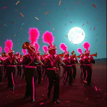 swing march, college band, playful brass, mid-tempo instrumental, jazzy trumpet melody, whimsical, marching band swing, 1970s college pep band, no vocals