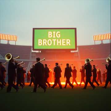 strong trumpet marching band, brass band, trumpet lead melody, horn section heavy, Beatles Abbey Road style, quirky rock, marching band arrangement, punchy brass stabs, trombone, mellophone, fortissimo brass, country male vocals, country female vocals, male female duet, outlaw country singers, gritty voices, absurdist comedy rock, bouncy and driving tempo