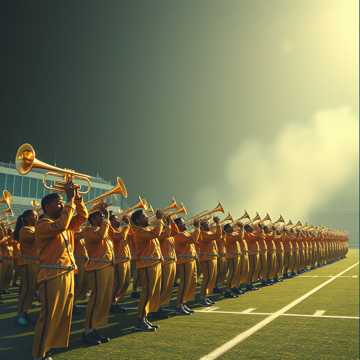 funk marching band, stadium brass, punchy horn hits, 70s funk rock, college football halftime, driving groove, staccato brass stabs, energetic instrumental, outdoor stadium sound, no vocals