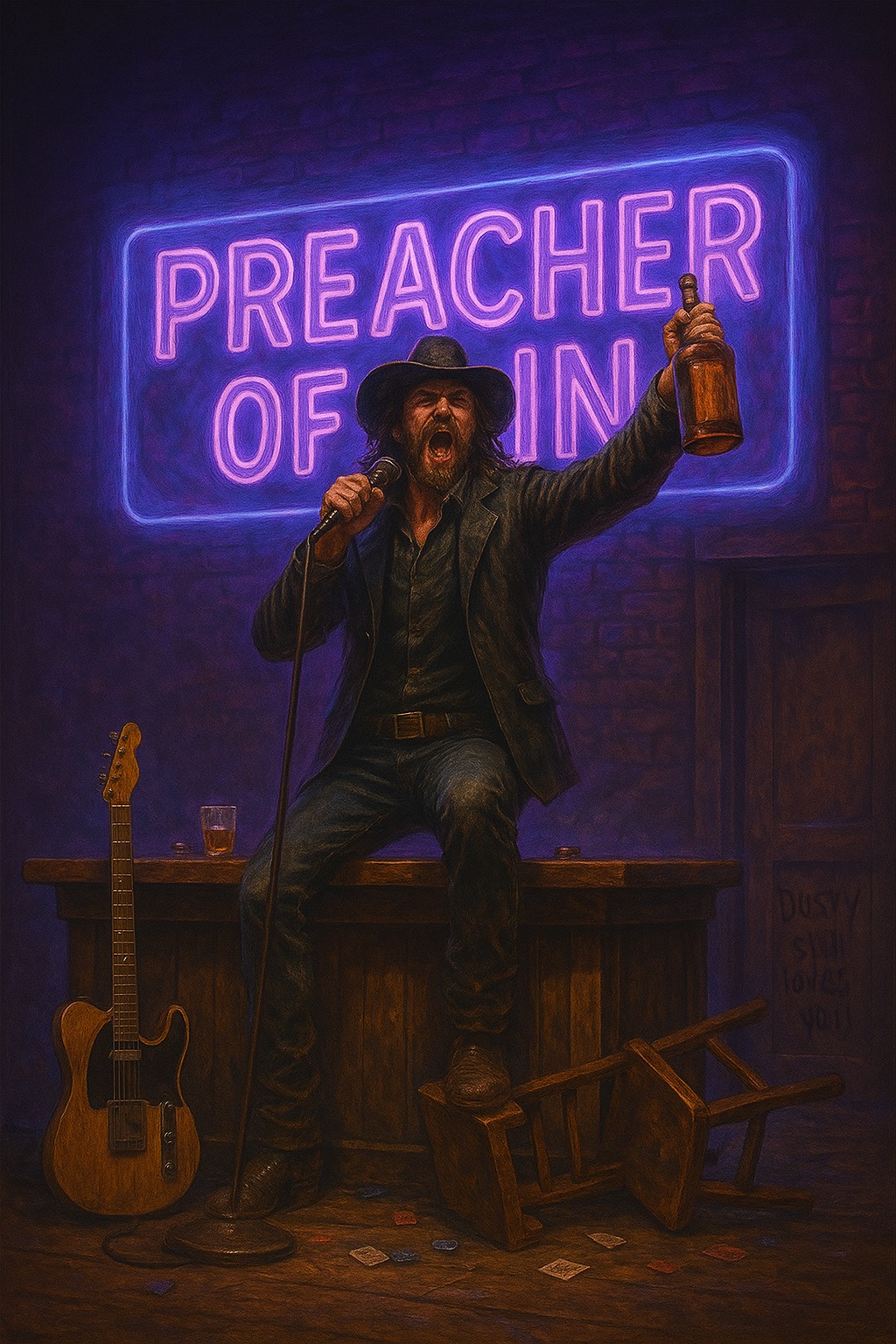 key minor, electric fiddle fire, rap, neon in our souls, ”, electric, pedal steel moans, outlaw country, driving groove, sharp trap hats, vocals raw, dark & defiant, gospel wails swell in the chorus: “preacher of sin tonight… preacher of sin for life!” end with grit: “we are no angels… fire in our throats, outlaw in our veins, gospel, raw, outlaw country rap-trap fusion, telecaster twang, whiskey-soaked, like a preacher from a barstool droppin’ the sermon nobody wanted, tempo mid-fast, outlaw drums with dirty 808s