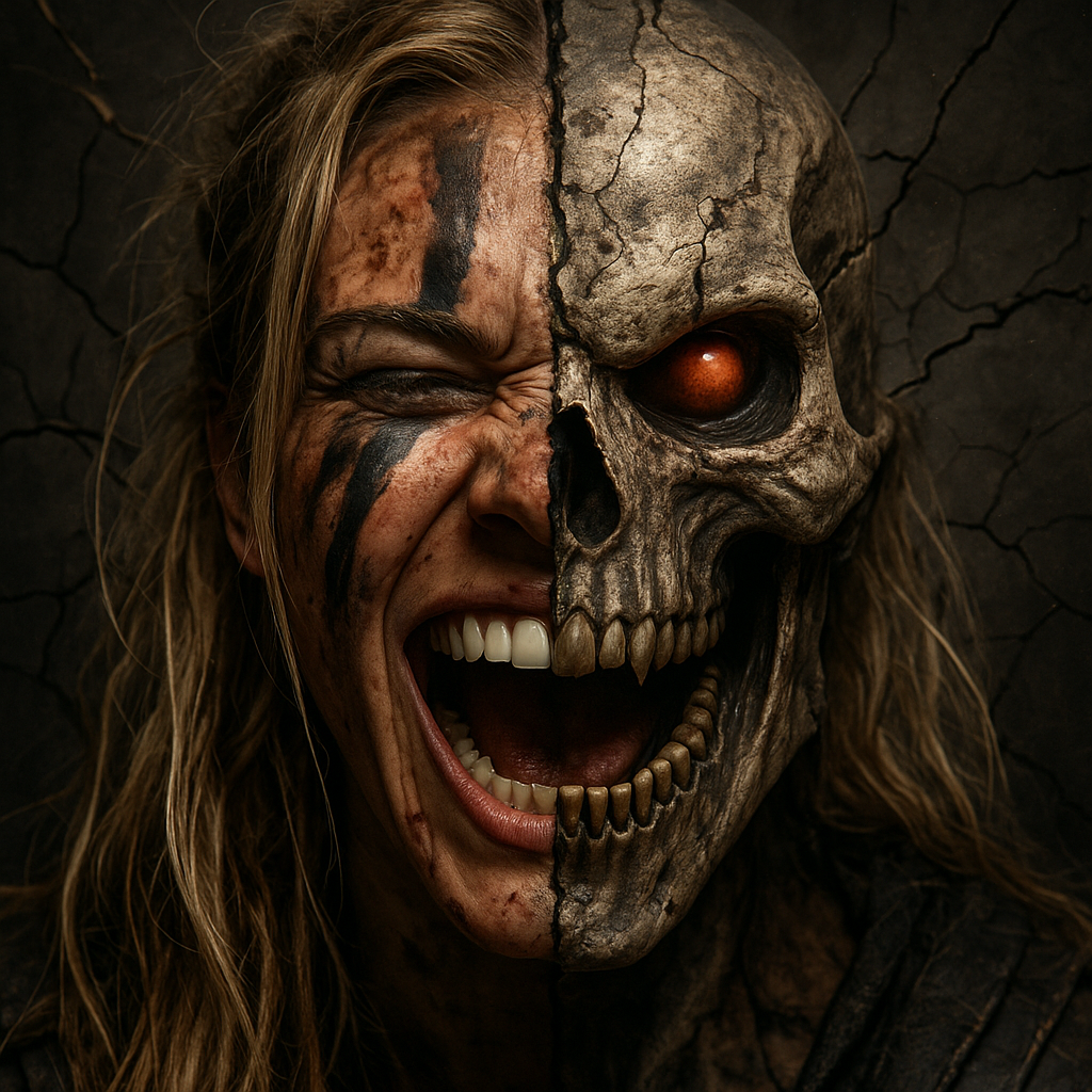 Metalcore track explodes with rapid-fire riffs and tectonic double-kick drums, Opener features insane laughter and glitch FX, then erupts into guttural growls and primal screams, Flow rap verses layer over syncopated guitars, Cinematic villain-vs-hero dynamics appear via demonic choir stabs and soaring angelic pads—each breakdown cunningly savage, fusing chaos with unstoppable momentum