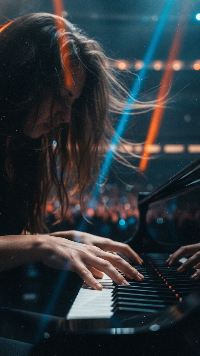 An uplifting, powerful, and anthemic Italian pop-rock song, written in the bright and powerful key of E Major, The arrangement builds from an intimate piano and voice intro to an explosive, full-band climax, It features a driving rhythm section, powerful piano chords, clean electric guitars, and a lush string section that swells in the choruses, The vocal is the centerpiece: a powerful, versatile, and highly emotive female voice, capable of moving from a delicate, breathy whisper to soaring, powerful, and crystal-clear high notes, The song features signature, ethereal vocal ad-libs