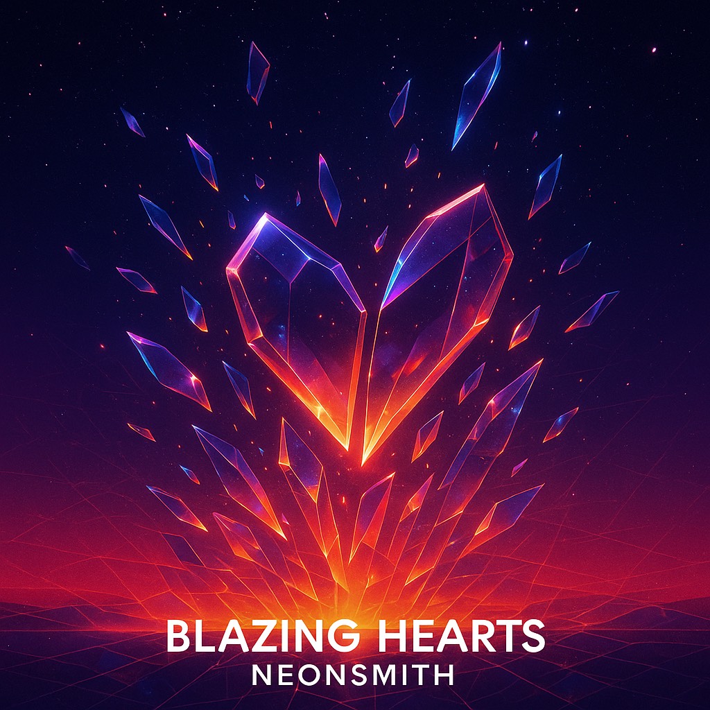 Euphoric house anthem fused with synthwave, Female vocals soar with emotional power, delivering short, chant-like lines that repeat for maximum impact, Verses build with tension, pre-chorus lifts, and choruses explode into massive drops, Four-on-the-floor beat, pulsing bass, wide retro pads, and shimmering neon arpeggios create a cosmic, radiant wall of sound, The mood is uplifting and mythic — blazing hearts burning forever under neon skies
