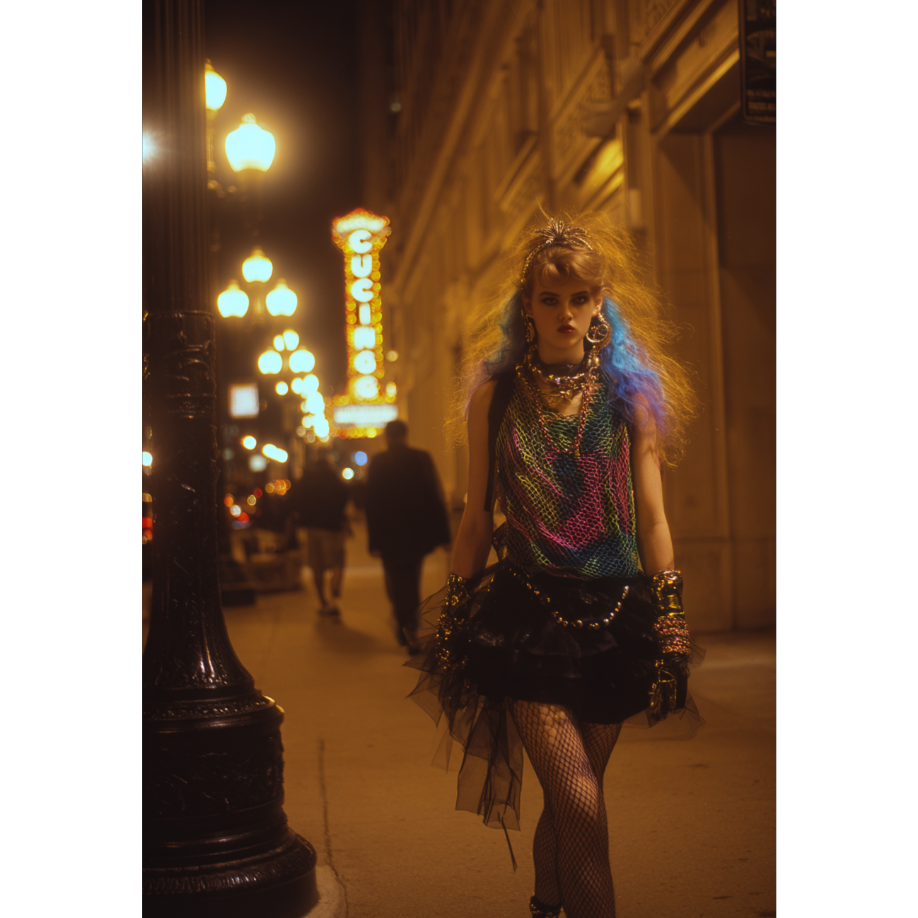 1980's tough girl power rock anthem with attitude, Driving new wave drums and pulsing bass lay the foundation, layered with lush 80s synths and rhythmic piano, Harpsichord arpeggios interlock with the piano, adding a baroque pop touch, The tough mezzo-soprano leads, supported throughout by tight, expressive three-part polyphonic harmonies, Shepard tones ascend throughout