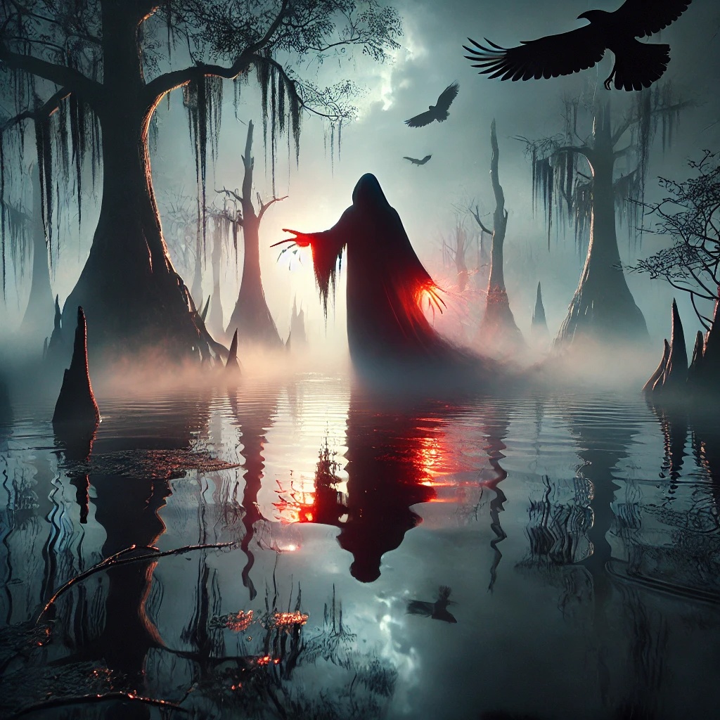 Swampy blues slide guitar, deep war drums, eerie throat singing, Ethereal female vocals, Dark, cinematic atmosphere—Southern Gothic meets Norse myth, Full progression with slow fade-out