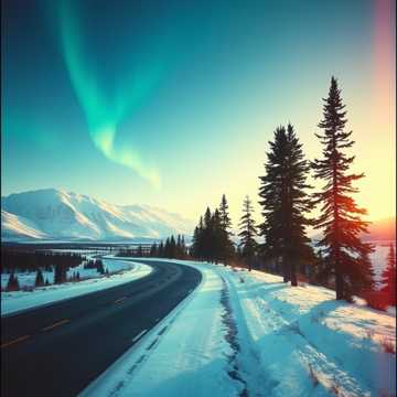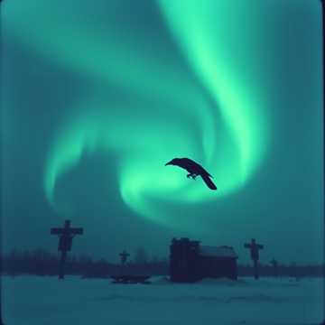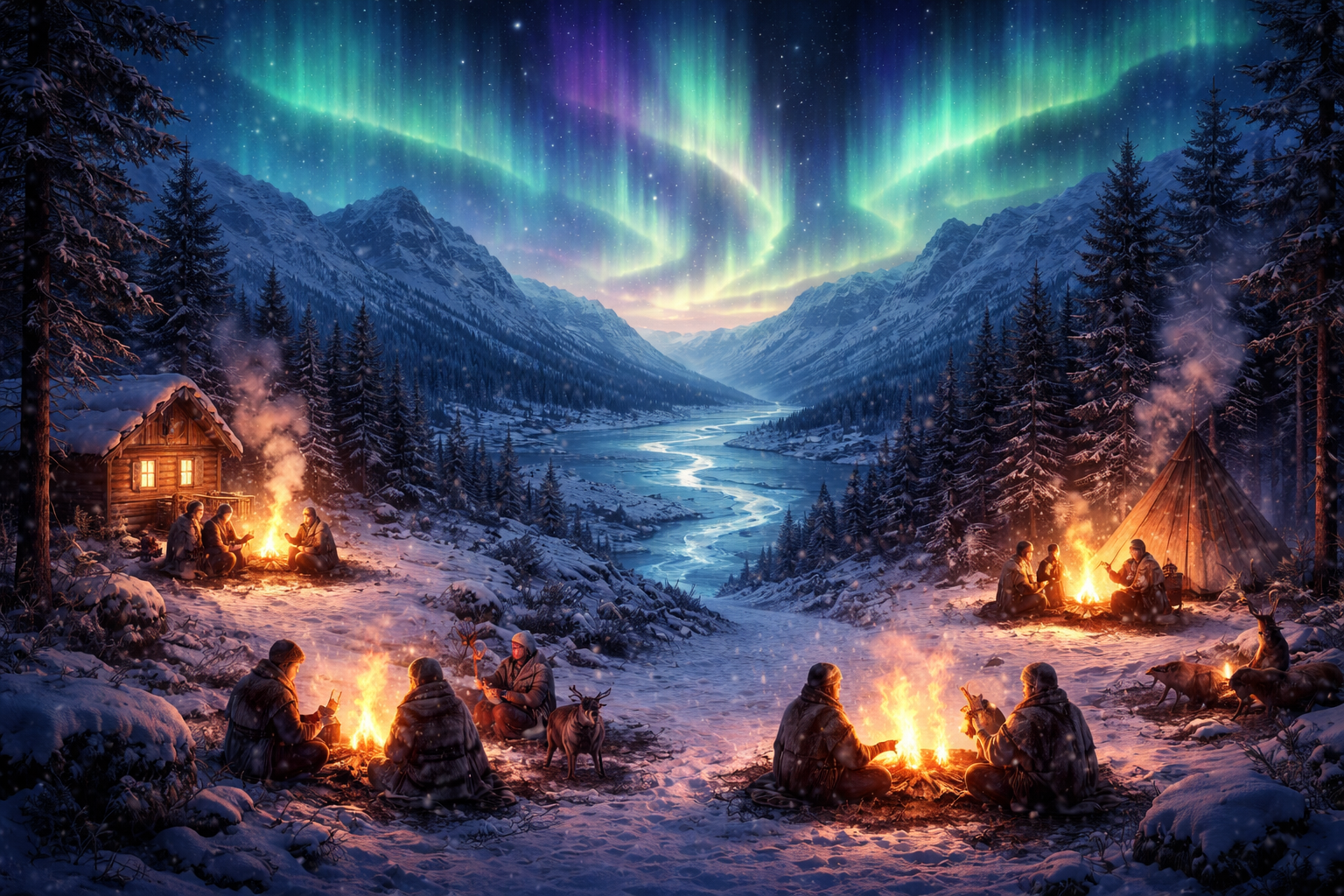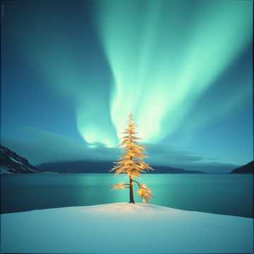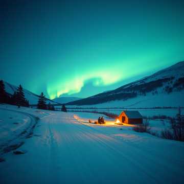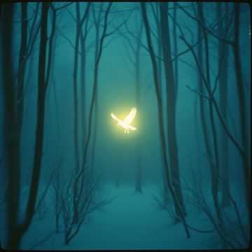 Thema: A magical heartlight bird guiding two souls through snowy northern forests, connection, warmth in the night
