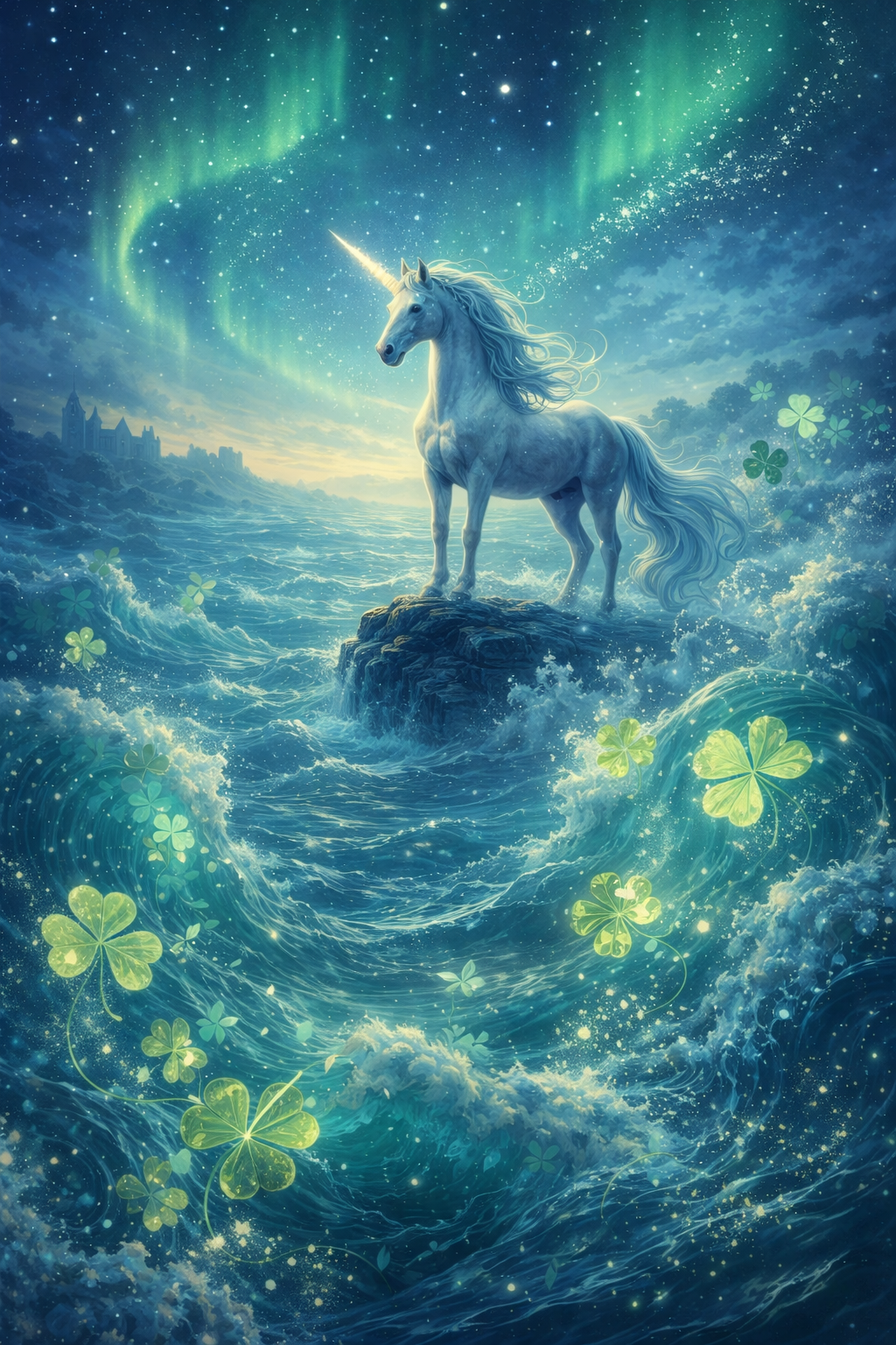 A magical scene set on a misty northern coast at twilight, featuring a glowing unicorn with a soft pearl-white horn standing gracefully on an ancient rocky outcrop surrounded by shimmering northern waves, floating clover leaves (with three and four petals) gently circling around, soft glimmers of stardust in the air, the aurora borealis lighting the sky in pale blues and greens, faint ruins of a lost Nordic settlement in the distant background, the unicorn's eyes glowing with wisdom, poetic and dreamy atmosphere, ethereal lighting, fantasy realism style, high detail, soft focus, watercolor hues, Nordic Pop Ballade - norwegian