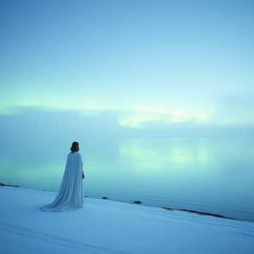 gentle, ethereal nordic folk ballad featuring a rotating ensemble of vocals in Norwegian, Finnish, Northern Sami and Tuvan, Delicate strings, soft reindeer bells, throat singing in final verse, warm woodwind in Finnish part, fjord echo delay on Norwegian vocals, Gentle hand drums, sparse wintery ambiance, Style: Emotive, peaceful, ancient yet modern, Chorus in Sami with atmospheric reverb