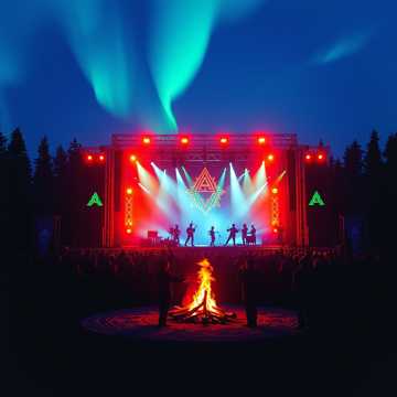 Norwegian hard rock live version, big audience, festival stage, powerful electric guitars, electric violin and bagpipes solo, energetic drums, both male & female vocals, call & response with audience, crowd claps and sings along, wild energy, 4 minutes