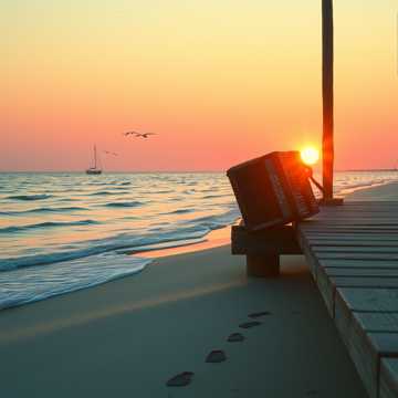 Sanft-maritimer dänischer Folk mit weiblicher Stimme, Akustikgitarre, dezente Mandoline, leichtes Akkordeon, leiser Rhythmus wie das Schaukeln eines Bootes, Möwen und Meeresrauschen im Hintergrund, Gefühl von Sehnsucht, Freiheit und einer großen Umarmung der Natur, Bridge gern instrumental mit Akkordeon, Outro langsam, wie ein Windhauch, der verweht