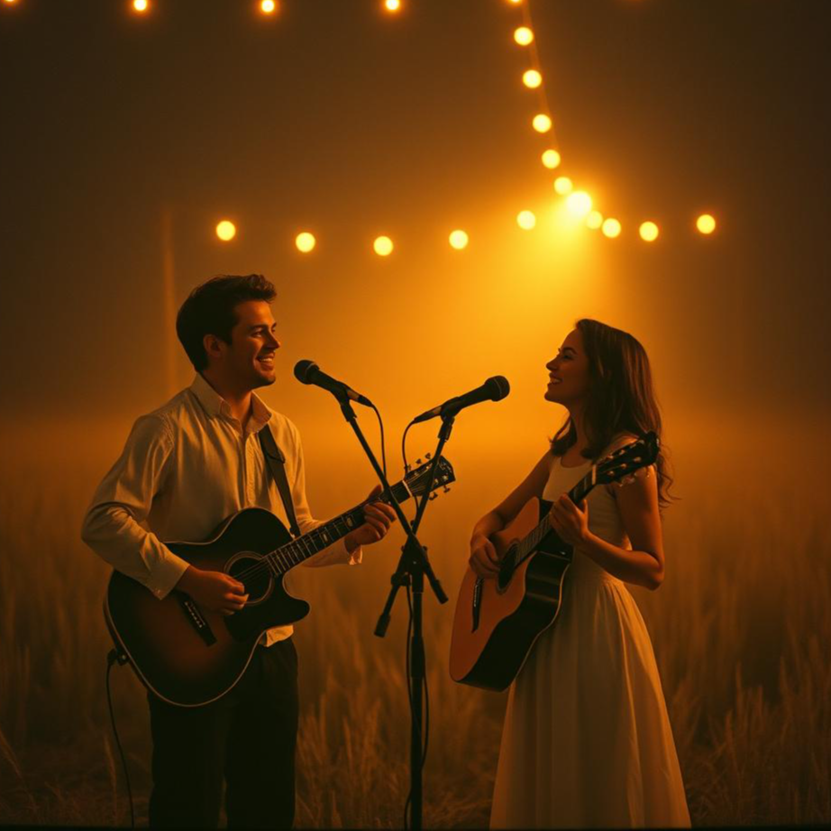 Warm country duet, heartfelt lyrics, acoustic guitar, brush drums, soft fiddle, slide guitar, pedal steel, emotional vocals, harmonies, nostalgic tone, organic feel, soulful pauses, storytelling, gentle dynamics, heartfelt build-up, rustic charm, deep connection, timeless melody