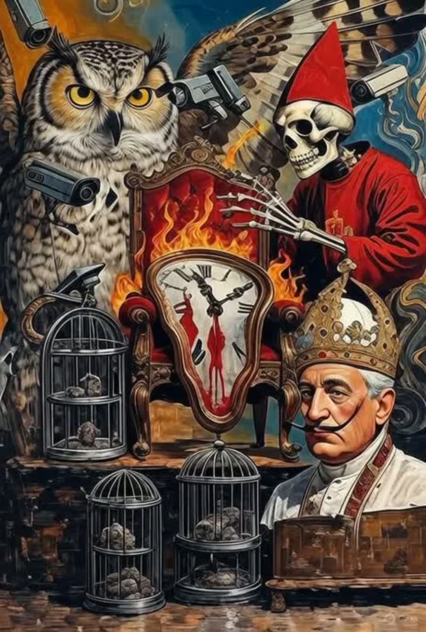 Perform a Spanish folk protest song expressive delivery, Maintain a moderate tempo of 60 BPM, accompanied by simple acoustic guitar strumming that remains minimal and supportive, Infuse the performance with deep emotions of sad, defiance, and unity, reflecting themes of freedom and resilience, Focus on a sincere, polished vocal style that inspires a sense of moral and strength, « Male voice imitating Salvador Dalí himself singing in French with a very strong, exaggerated Catalan-Spanish accent (rolled R’s, thick « rr », pronounced « j » as « rr », « ch » as « tch », open vowels), Theatrical, grandiose, narcissistic, bombastic delivery, half-sung half-declaimed
