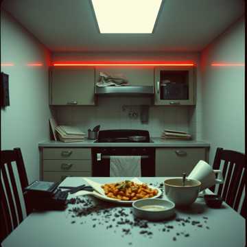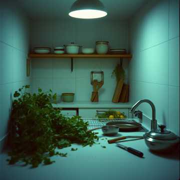 An ambient, spoken-word interlude within a theatrical rock opera, Sparse instrumentation—minimal piano, slow atmospheric pads, subtle textures, The male voice speaks and whispers poetic reflections in a cold kitchen, walking through emotional aftermath, The tone is hollow, detached, and sorrowful, Lyrics use decayed cooking imagery (cold butter, wilted herbs, sour wine) to convey emotional numbness and the quiet after a failed attempt at reconciliation, Designed to sound like a haunted room or a mental breakdown in slow motion