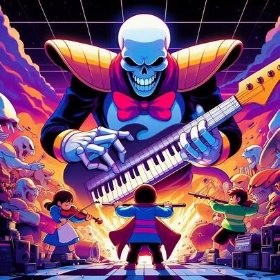 Undertale battle theme: fast-paced, piano, electric guitar, 8-bit style, energetic rhythm, epic orchestral score, heroic