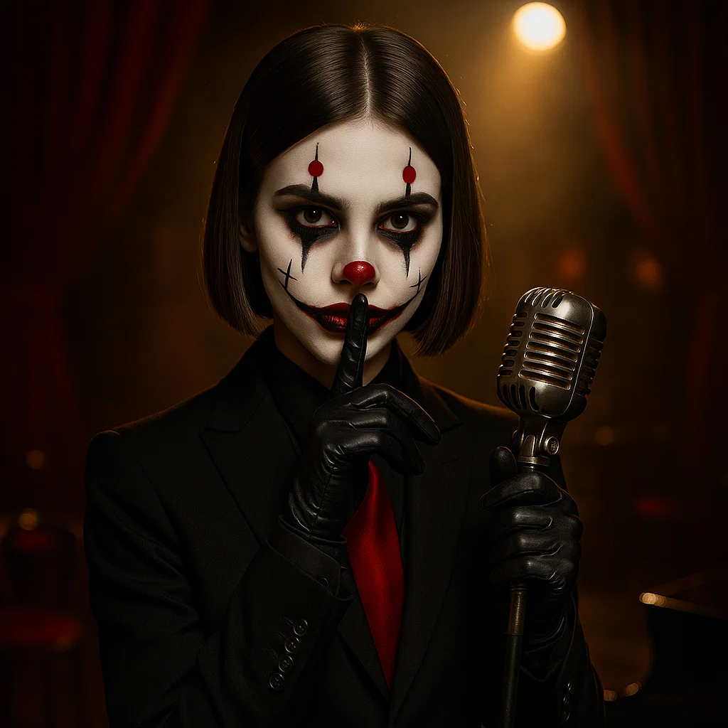 A dark cabaret/dark waltz drifts in 3/4 with acoustic guitar picking haunting arpeggios, Bass booms with gothic presence while knife-scraping textures swirl via immersive 3D audio, The rhythm sways with theatrical flair, A soothing female voice drapes each section in velvet calm