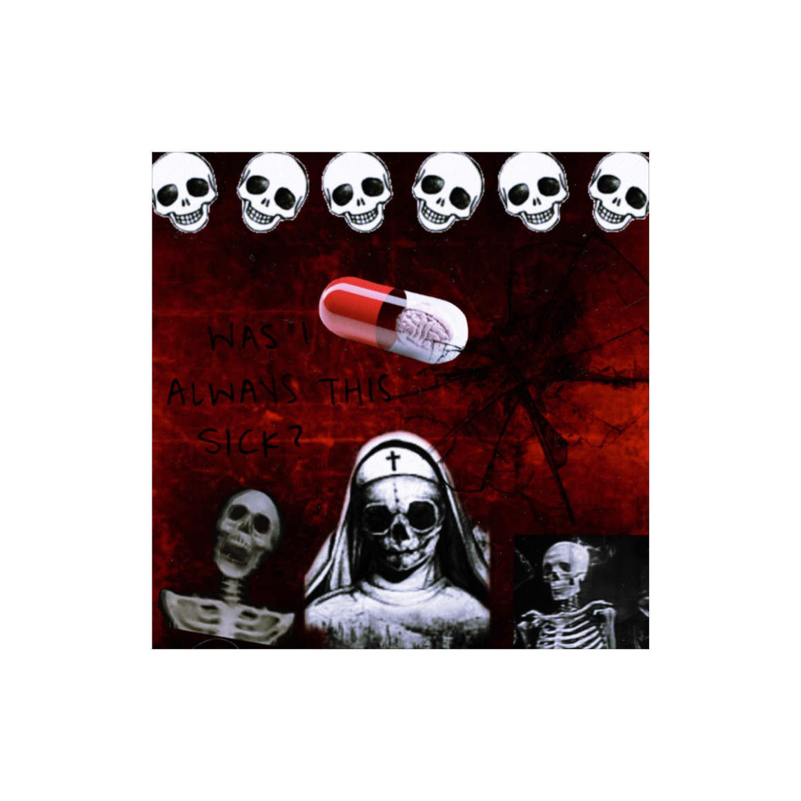 Heavy vinyl-crackled boom bap drums (kicks deep like medicine cabinets slamming), Dirty 808 bass with glitchy sub growls, Distorted guitar stabs layered with eerie synth bells (to mimic hospital monitors), Turntable scratches + chopped vocal samples (“side effects may include…” glitch voice), Psychedelic reverb sirens + warped horns for chaos, Structure: