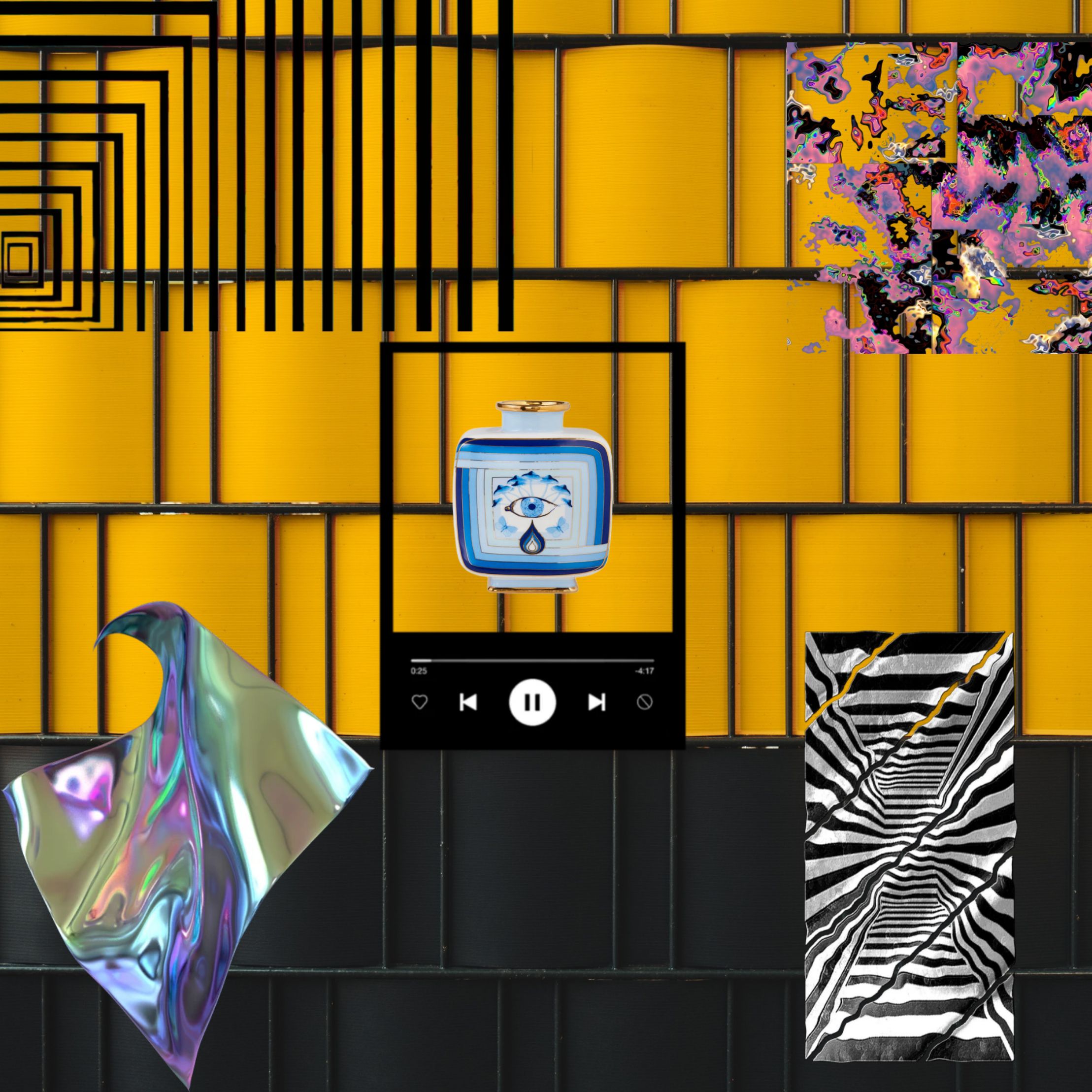 industrial glitch-hop 92 BPM paranoid yellow-black tension metallic percussion like chrome sheets bending deep oscillating bass pulses hypnotic minimal synth patterns like geometric grids repeating sudden glitch stutters and warped vinyl-stop effects eerie ceramic chime melody like tapping porcelain psychedelic lead line dripping with liquid reverb occasional zebra-pattern panning sweeps left/right haunting modern trip-hop atmosphere calm eye-watcher moment in the center with no drums for 8 bars, only glassy pads and a single metallic droplet sound drums return sharper and more angular sound design like abstract art breathing cinematic, stylish, unsettling, beautiful