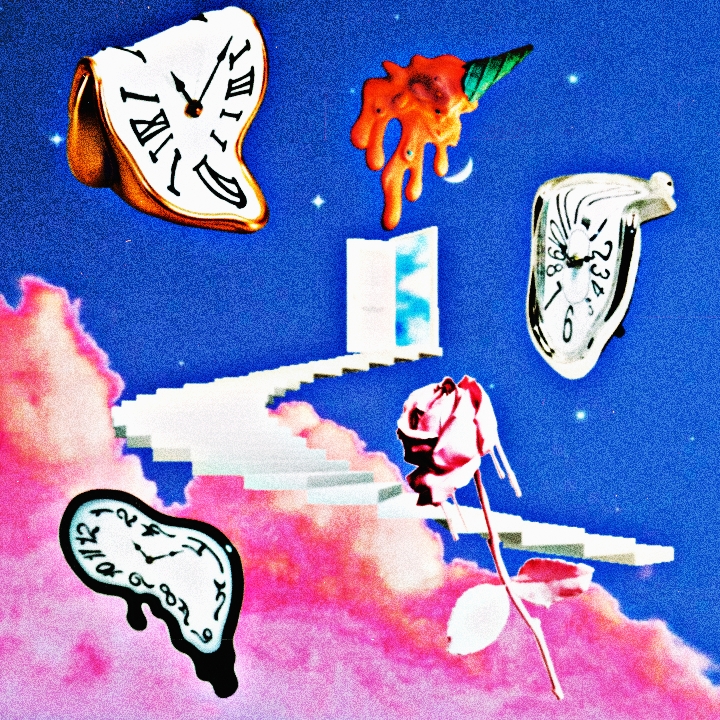 Trippy jazzy boom-bap with surreal looping intro, Psychedelic hip-hop meets abstract poetry, Jazzy piano chords, upright bass, vinyl crackle, brushed snares, ticking clock FX, and playful scat ad-libs, Dreamlike, hypnotic atmosphere with occasional beat stutters / rewinds, Intro: