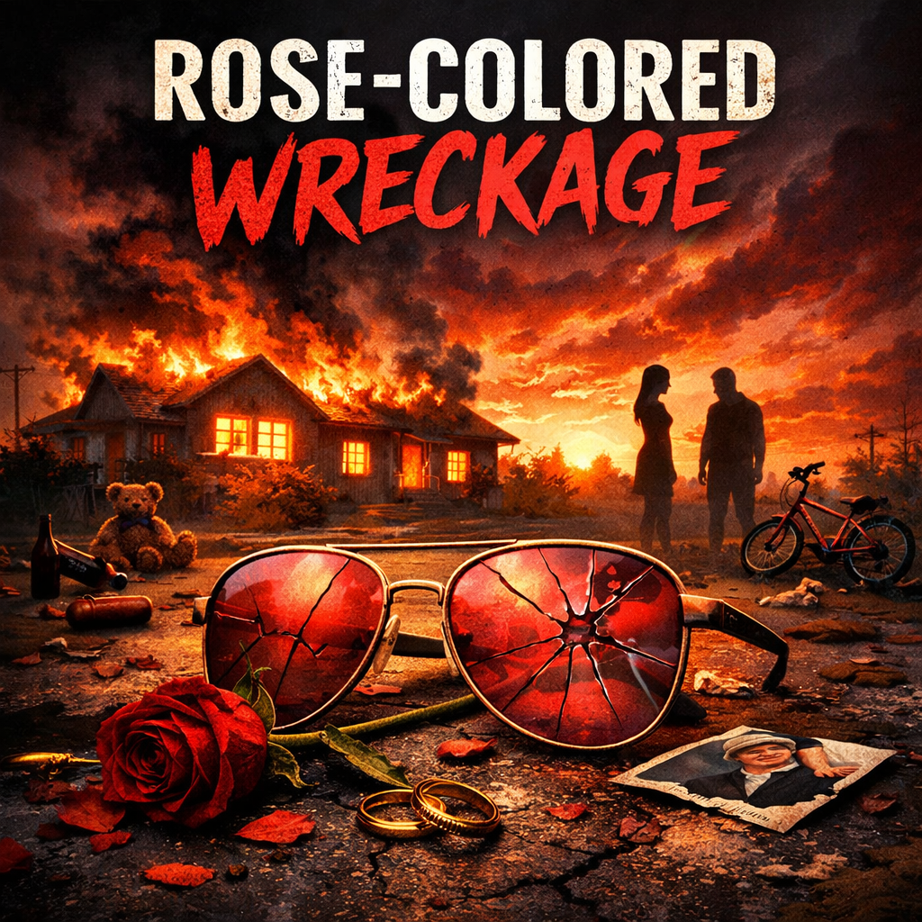 Fast-paced alternative rock / pop-punk song with dark emotional weight, Tempo 160–180 BPM, Driving distorted guitars, punchy palm-muted verses, explosive choruses, tight drums with aggressive fills, strong bass presence, Gritty but melodic female vocals with emotional intensity, clear enunciation, slight rasp in choruses, Verse melodies tense and restrained, pre-chorus builds with rising chords, chorus hits big and anthemic with chant-worthy hook, Lyrics tell a cinematic story of high school sweethearts reconnecting, rushed marriage, hidden infidelity, manipulation, alcohol, emotional decay, and rose-colored denial, Mood: urgent, dramatic, bitter-sweet, confrontational, Production polished but raw, modern pop-punk edge with alternative rock depth, No spoken word, No ad-libs, Focus on energy, momentum, and a massive chorus payoff