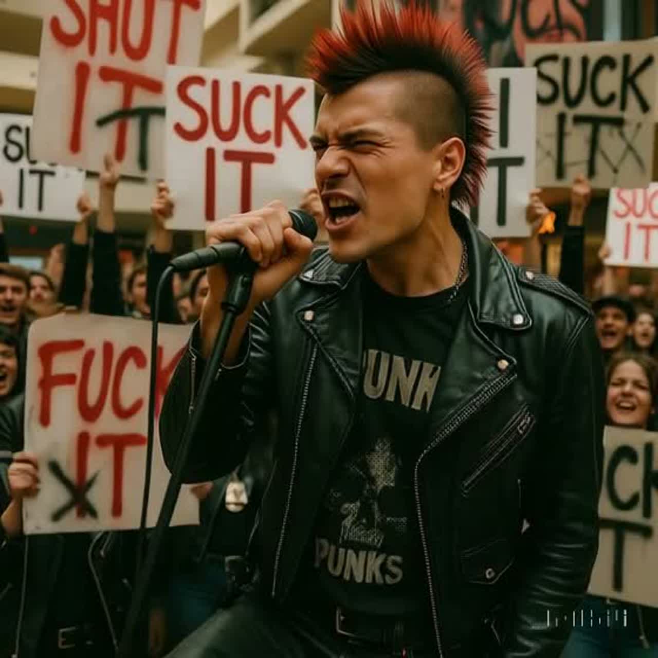 Aggressive Protest Punk, raw fast-paced hardcore, gritty distorted guitars, driving drums, shouting angry vocals, high-energy, 180 BPM, visceral, political rage