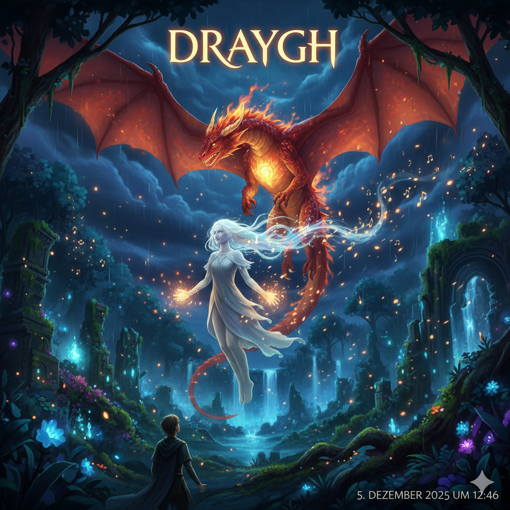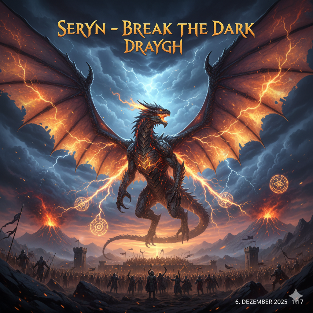 Epic emotional fantasy soundtrack inspired by “Ori and the Blind Forest”, Soft piano opening, rising warm strings, deep pulsating drums and a mystical airy choir, Atmosphere: magical, glowing, heroic, Female vocal, ethereal yet powerful, like an ancient spirit calling through darkness, Her voice carries the story of Seryn, a red fire dragon with a golden core – strong, determined, yet fragile within, The music builds with shimmering pads and fiery accents, growing into soaring melodies that feel like wings cutting through a storm, A blend of hope, light and epic fantasy energy, shining with Seryn’s inner fire