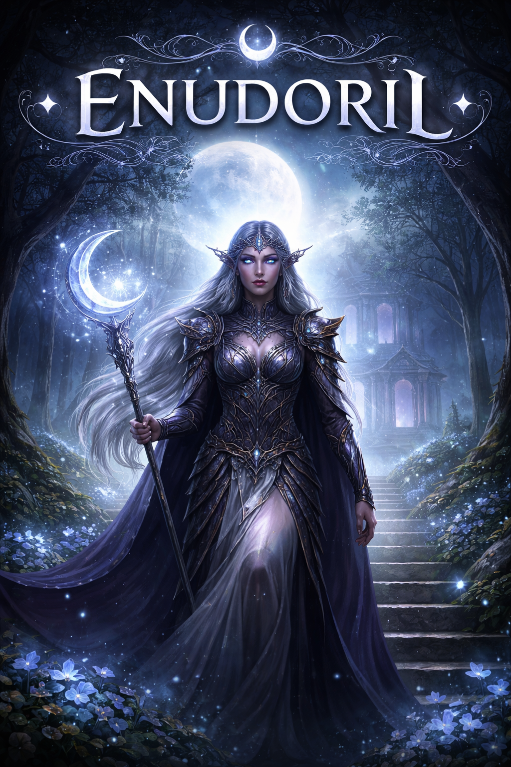 Powerful female lead vocal (mezzo/alto), priestess-warrior chant meets cinematic folk-rock, 92 BPM, minor key, ritual drums + toms, low strings, choir pads, cathedral reverb, confident chest voice, verses solemn and controlled, chorus belted and anthem-like, Elune moonlit mysticism, no breathy vocals, no whisper vocals