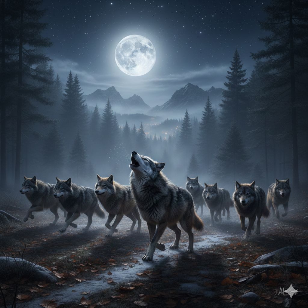 Folk-Rock with strong acoustic guitar presence, driving drums, and a prominent bass line, The energy is powerful and grounded, evoking the atmosphere of a deep, cold forest at night, Tempo is moderate, suitable for a road trip or a long walk, The mood is watchful and slightly mystical, Vocals are a male solo voice, clear and slightly gritty, with harmonies joining in the choruses to add a sense of the pack