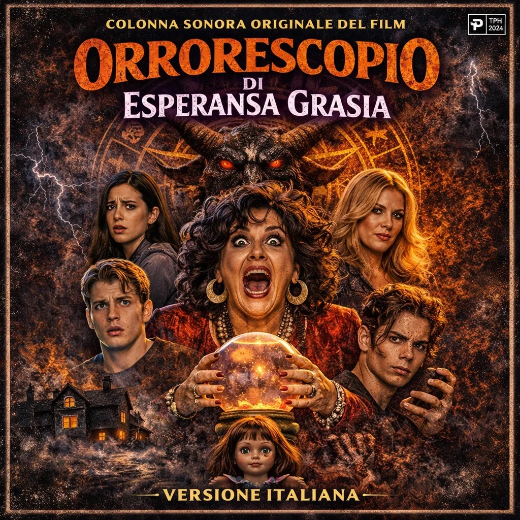 italian theatrical pop, broadway finale, ensemble cast vocals, mixed-gender harmonies, half-spoken croon, full-throated belt, electric violin riffs, brass stabs, stomping percussion, snare rolls, dance break, sound effects, key-change lift, plate reverb, sidechain compression, glittering button chord, comic horror, anthemic, 128 BPM