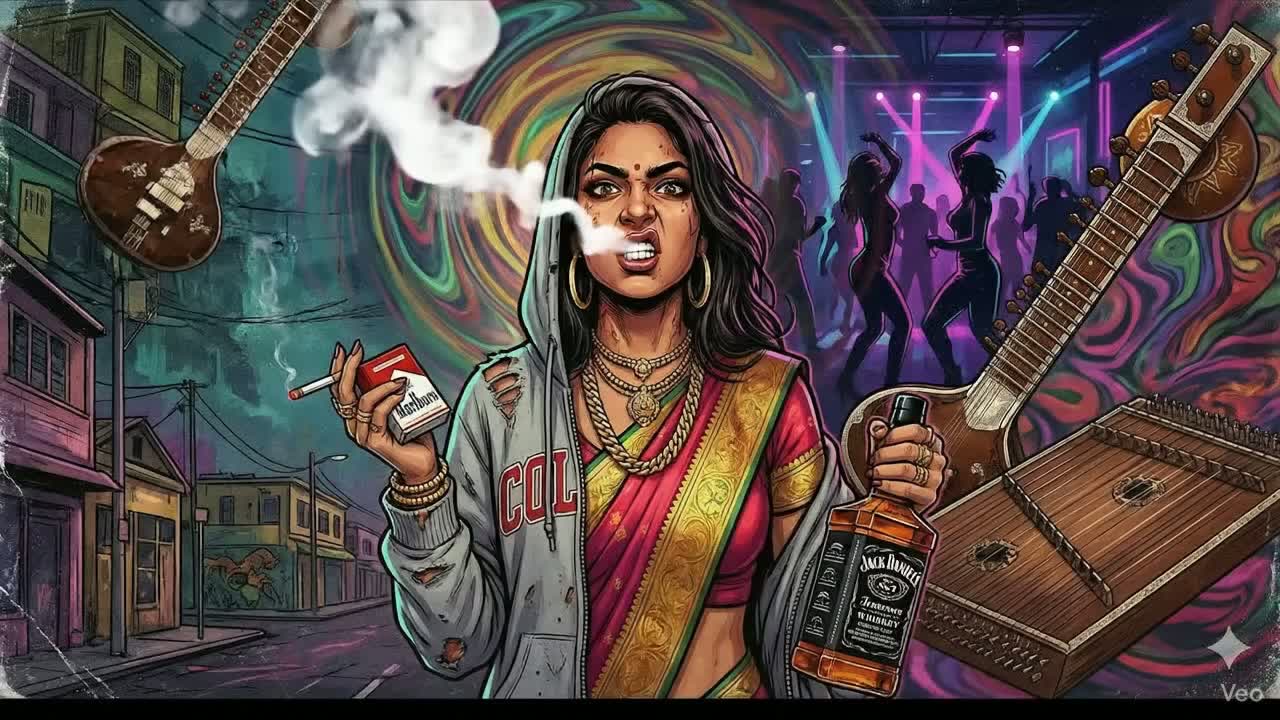 Bollywood Baddie Trap:Dark Emo Salsa:Dancehall 40:30:30, 144 BPM, G Minor to A Minor, Electric Sitar lead, Requinto counter-melody, Santoor arpeggios, Daf hi-hat triplets, Tabla and Djembe percussion, distorted 808s sidechained to kick, Aggressive female rap, Patois-Spanglish flow, confident, sassy, narcissistic, [Complex morphing dynamic EQ], [Activate audio repair with spectral manipulation], [Sophisticated sound design], [Final master]