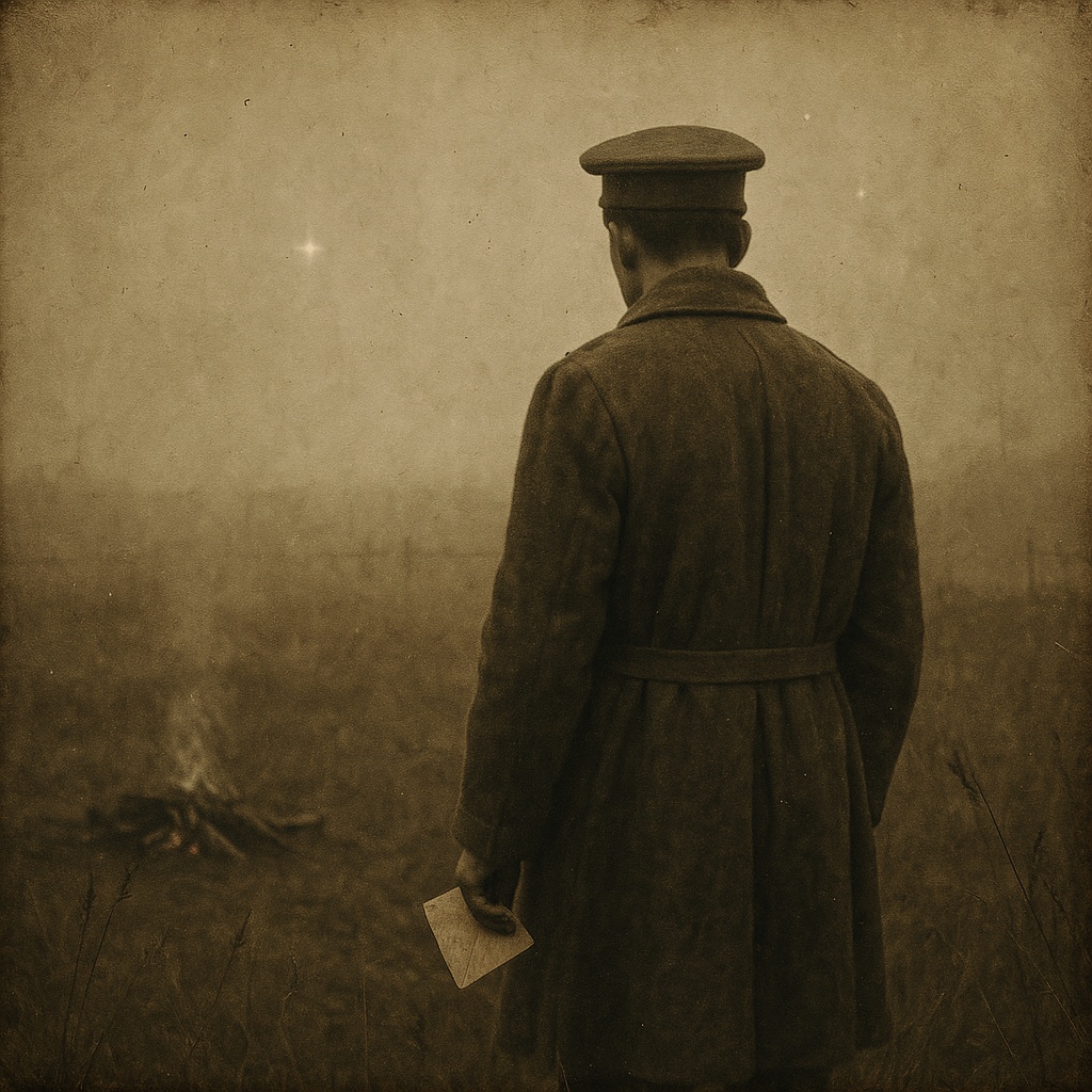 Wartime lament 76 BPM slow military ballad with acoustic guitar soft snare drum solo trumpet and low male choir minor harmony warm lo-fi field-recording tone strophic structure focus on emotional restraint and homesick lyricism, ‑victory themes, ‑orchestral grandeur, ‑fast rhythm, ‑brass fanfares, ‑electronic instruments, ‑modern vocals, ‑English lyrics, ‑dramatic vocal runs, ‑political content, ‑optimistic major harmonies, ‑energetic dynamics