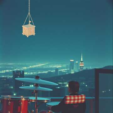 jazz, Avant‑garde jazz energy with upright bass and a traveling arsenal of hand drums, bells, and unusual world percussion, Male vocals half-sung, half-spoken, riding frenetic, unpredictable grooves, Rhythms tumble and overlap like conversations in a crowded plaza, with sudden drops to near-silence, The ending explodes into a virtuosic, extended drum solo that gradually strips down to one insistent pulse