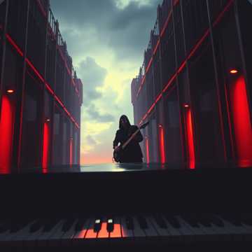 metal, Piano‑driven Latin metal; dark, driving left‑hand piano riffs double the rhythm guitars, right hand throws rapid arpeggios and dramatic stabs, Double‑time drums with syncopated Latin accents, congas deep in the mix, Verses stay tense and clipped; chorus opens wide with gang vocals and soaring male lead, distorted bass gluing it all together, Bridge drops to half‑time with reverb‑drenched solo piano over chugging guitars before a final explosive chorus