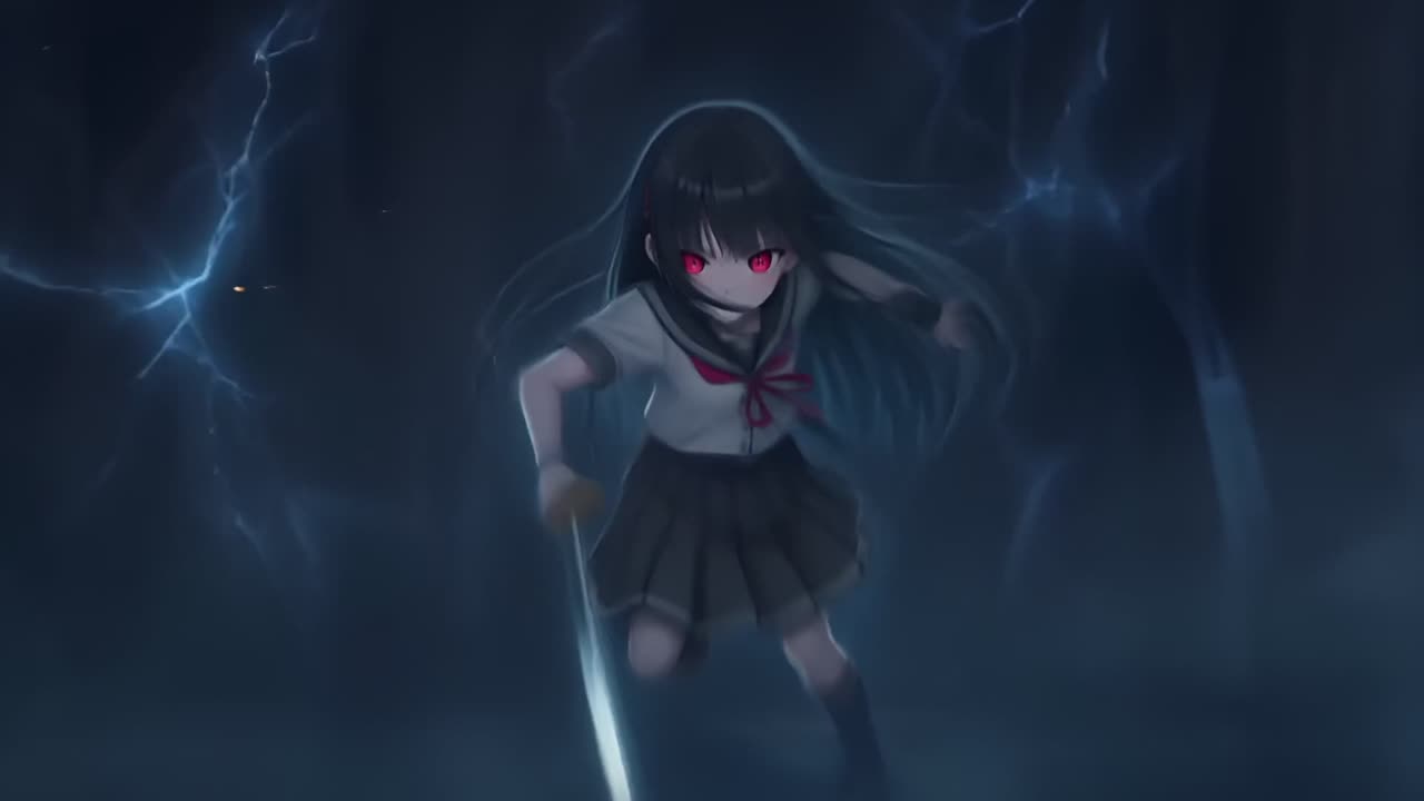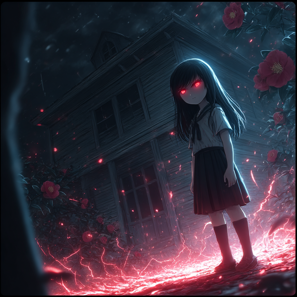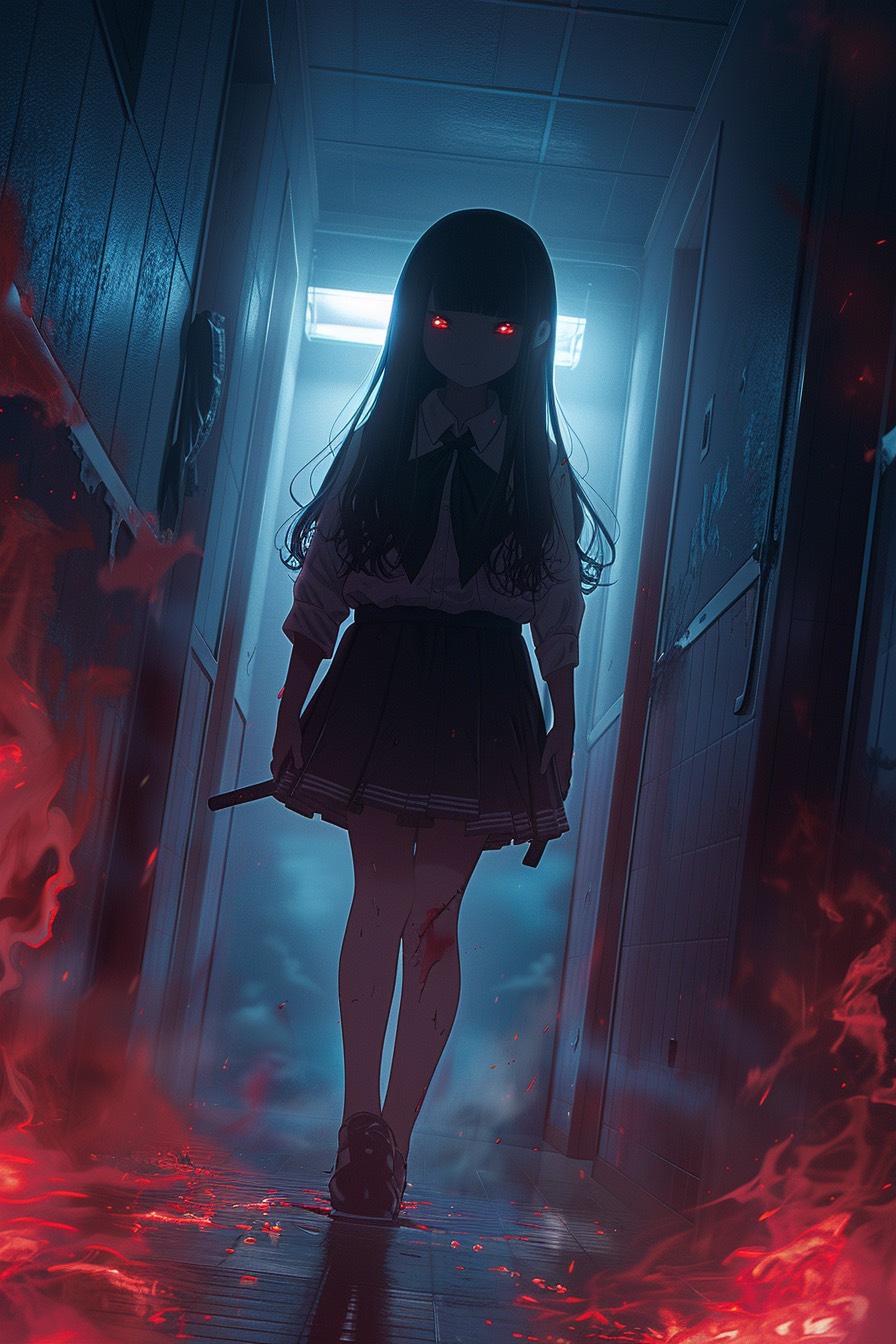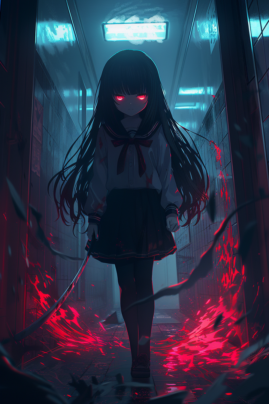 Fast-paced horror rock anime style, Aggressive guitar riffs, driving drums, dark bass, Female whisper voice mixed with sharp vocals, Echo effects, distorted piano, tense atmosphere, emotional yet violent, supernatural battle energy