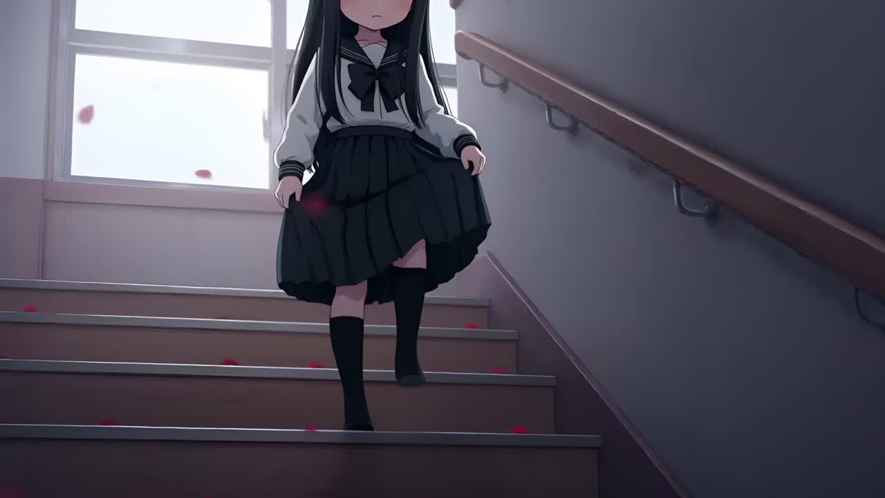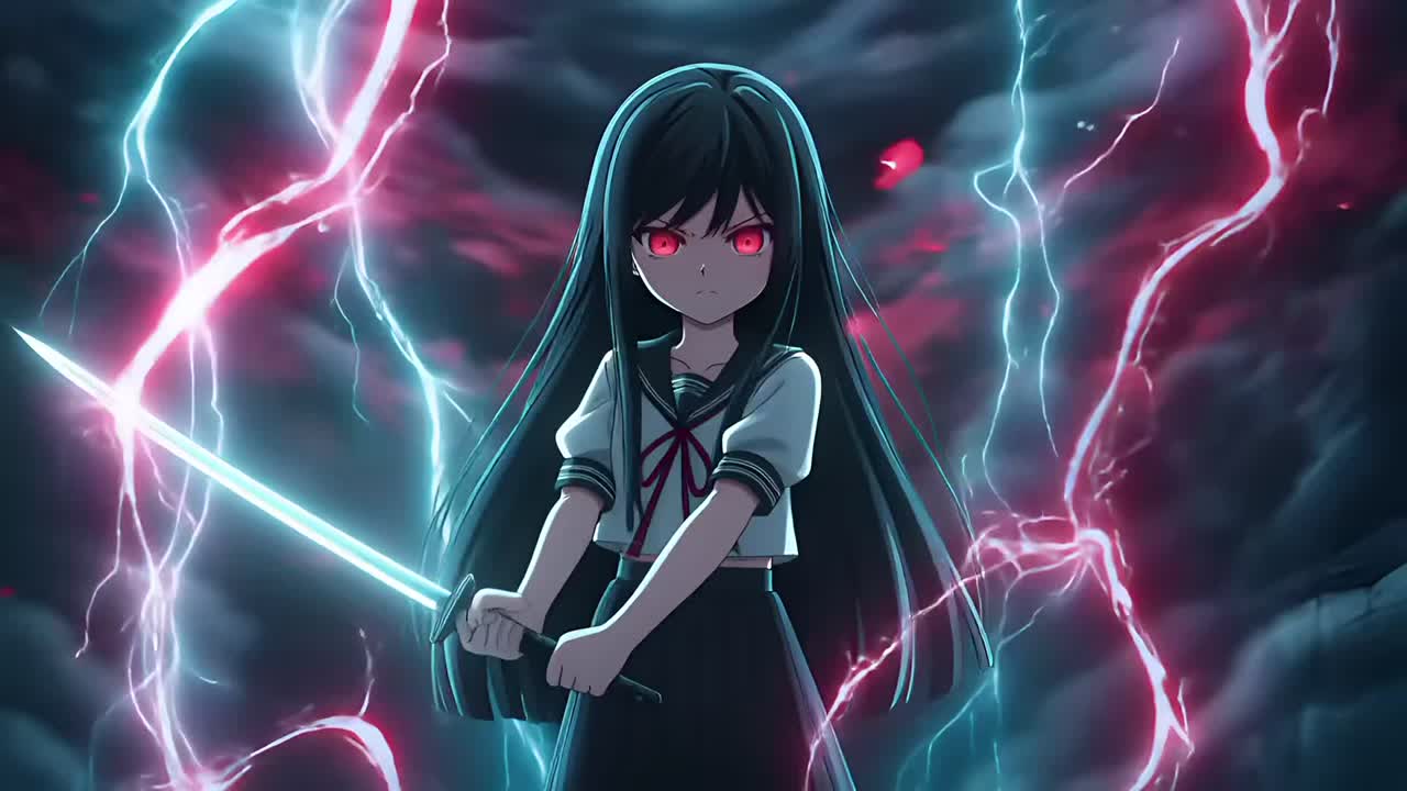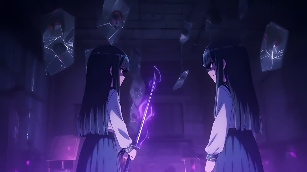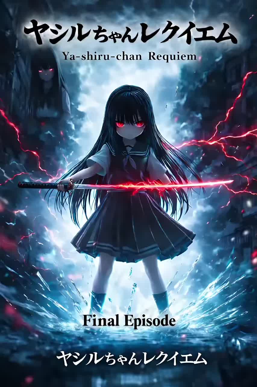 Fast-paced horror rock anime style, Aggressive guitar riffs, driving drums, dark bass, Female whisper voice mixed with sharp vocals, Echo effects, distorted piano, tense atmosphere, emotional yet violent, supernatural battle energy