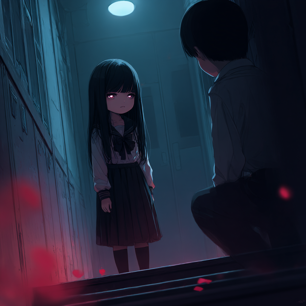 Dark horror rock with distorted electric guitars, dissonant riffs, heavy drums, whispered female vocals, sudden breaks, aggressive chorus, eerie silence, cinematic anime atmosphere, raw coolness, emotional tension, modern Japanese rock vibe